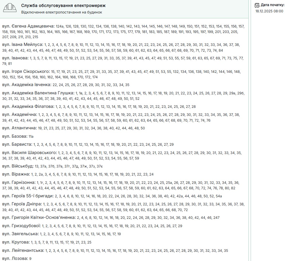 За наявною інформацією, з 08:00 до 17:00 електрику вимкнуть споживачам, які мешкають за такими адресами: