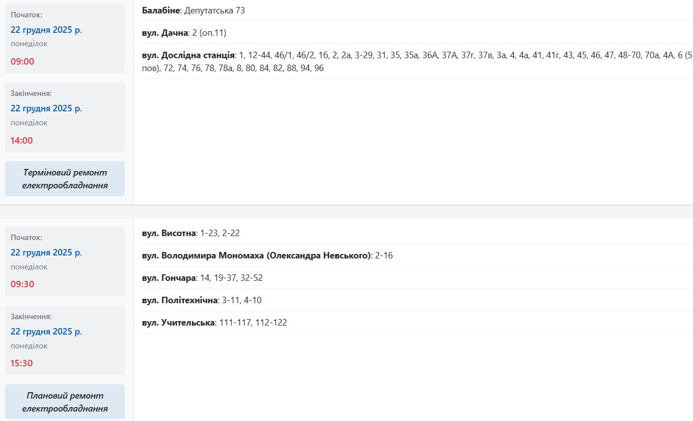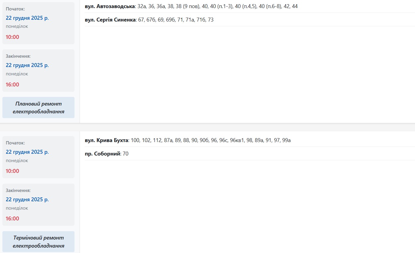 Також із 10:00 до 16:00 ремонт електрообладнання проводитимуть за наступними адресами: