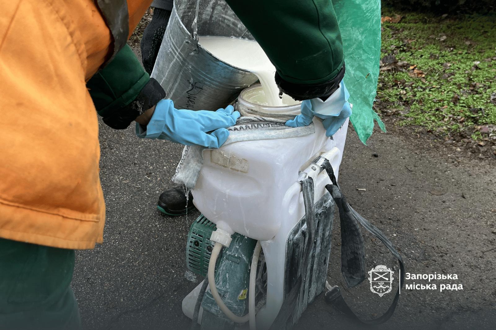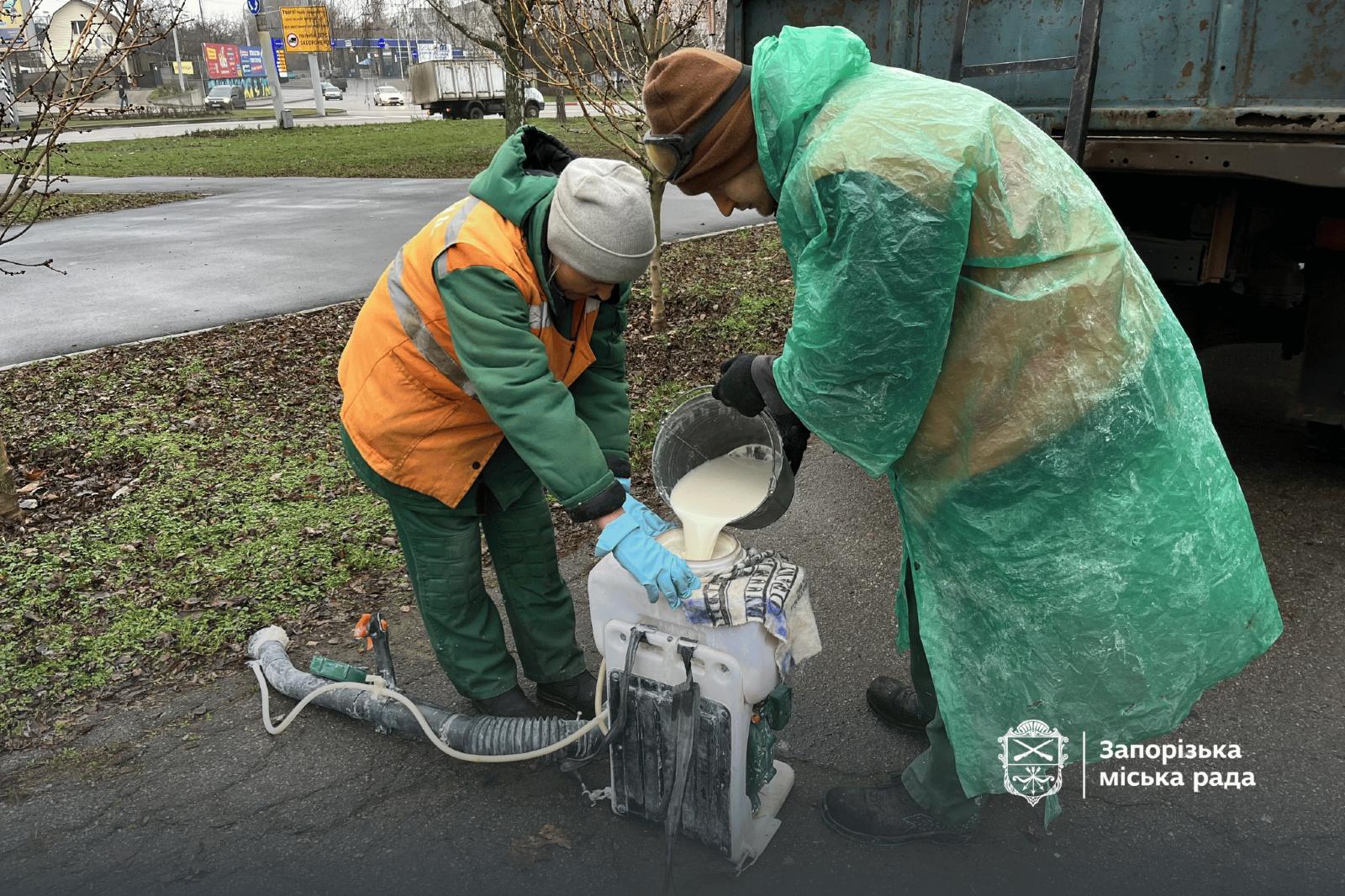 Тому фахівці вже обробили майже сотню дерев у різних районах міста, зокрема і в парках та на центральних площах. Наразі вони працюють у Дніпровському районі.
