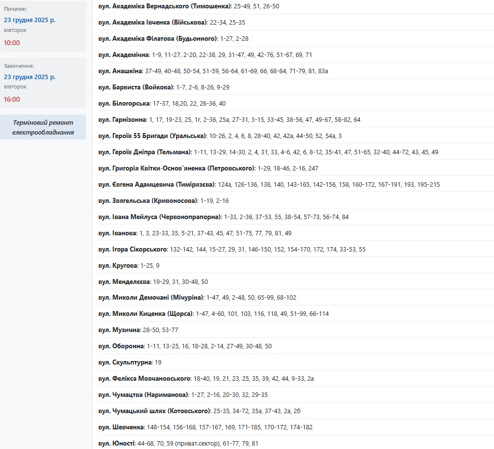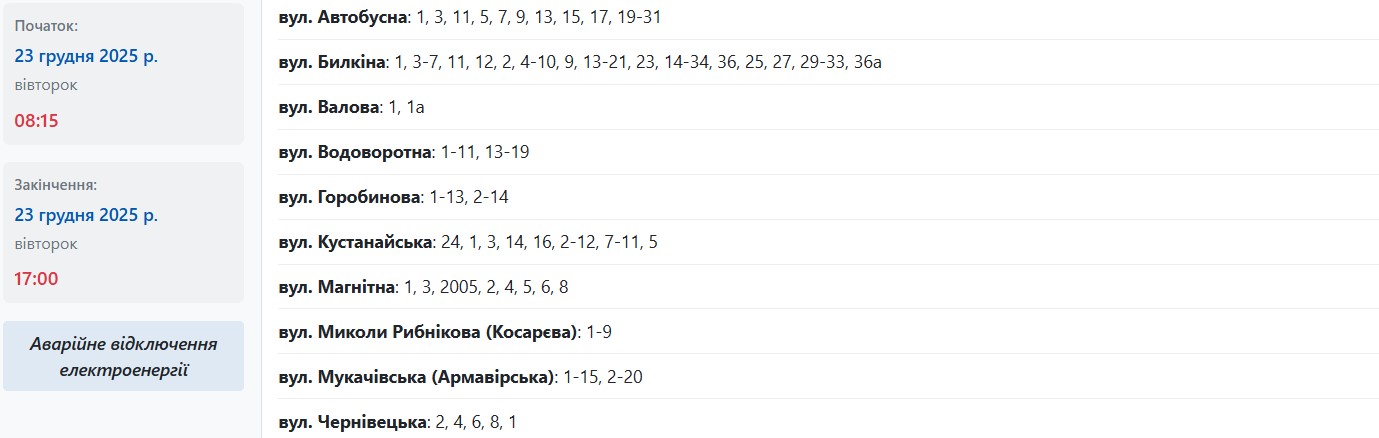 Вранці аварійне відключення електроенергії сталося за адресами: