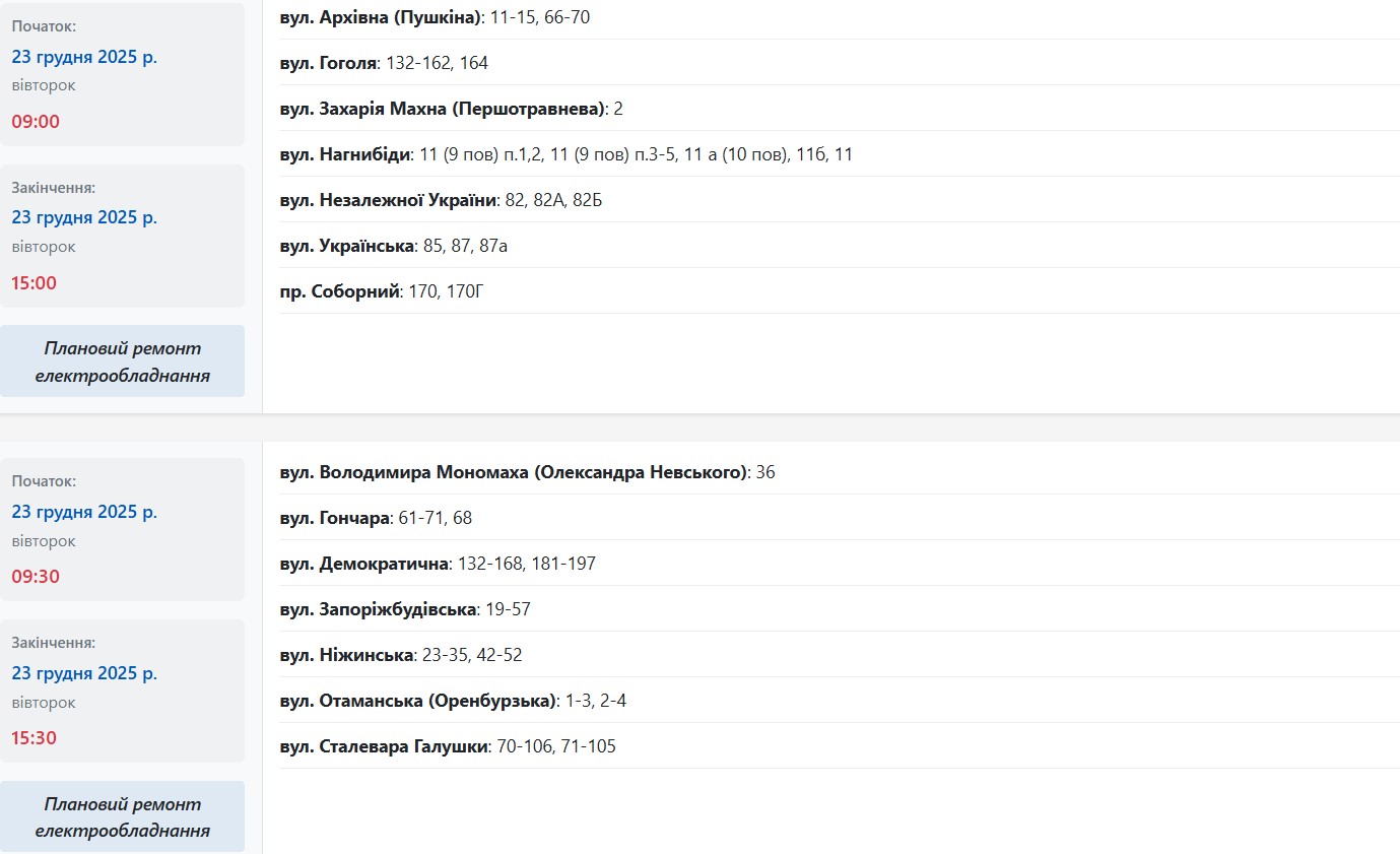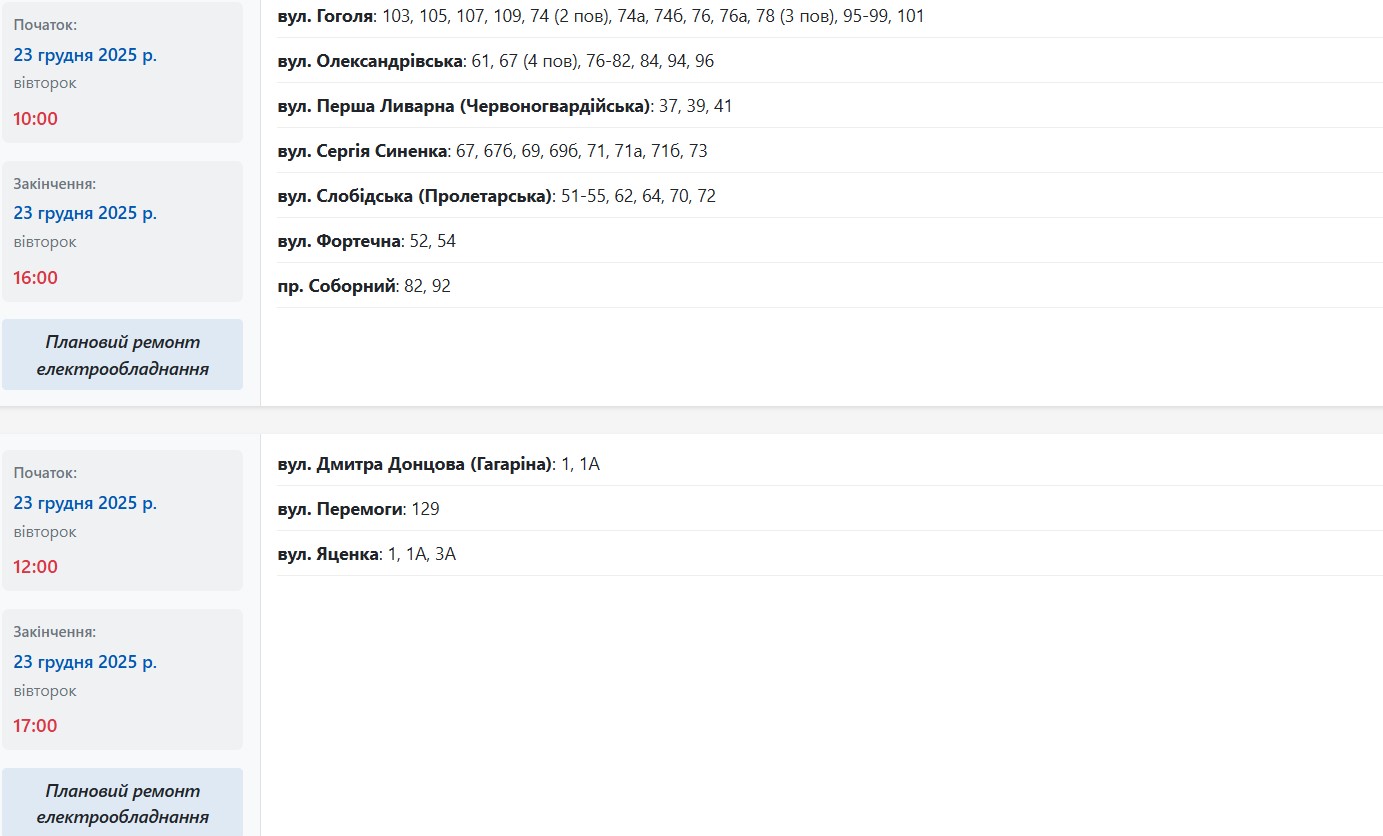 У вівторок, 23 грудня, у Запоріжжі знеструмлять понад 60 вулиць. Про це повідомляє Запоріжжяобленерго, передає "Справжнє".