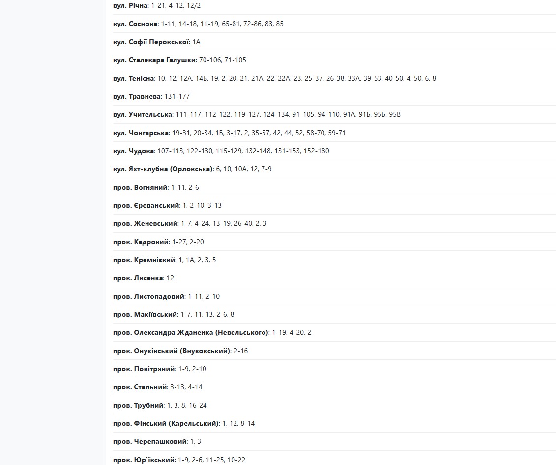 За даними енергетиків, із 09:00 до 15:00 електрики не буде у споживачів, які мешкають за адресами: