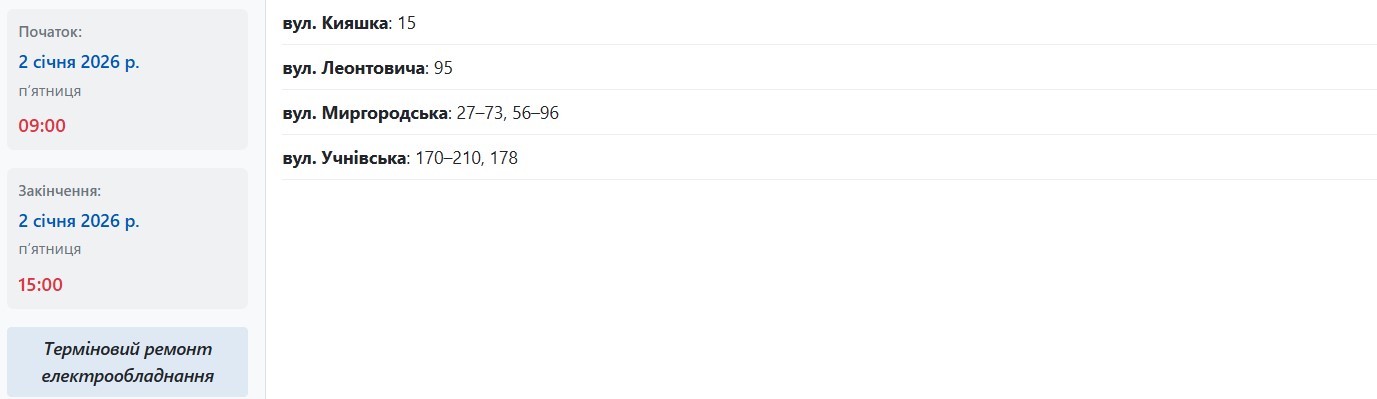 Окрім того, 2 січня сталося аварійне відключення електроенергії за такими адресами: