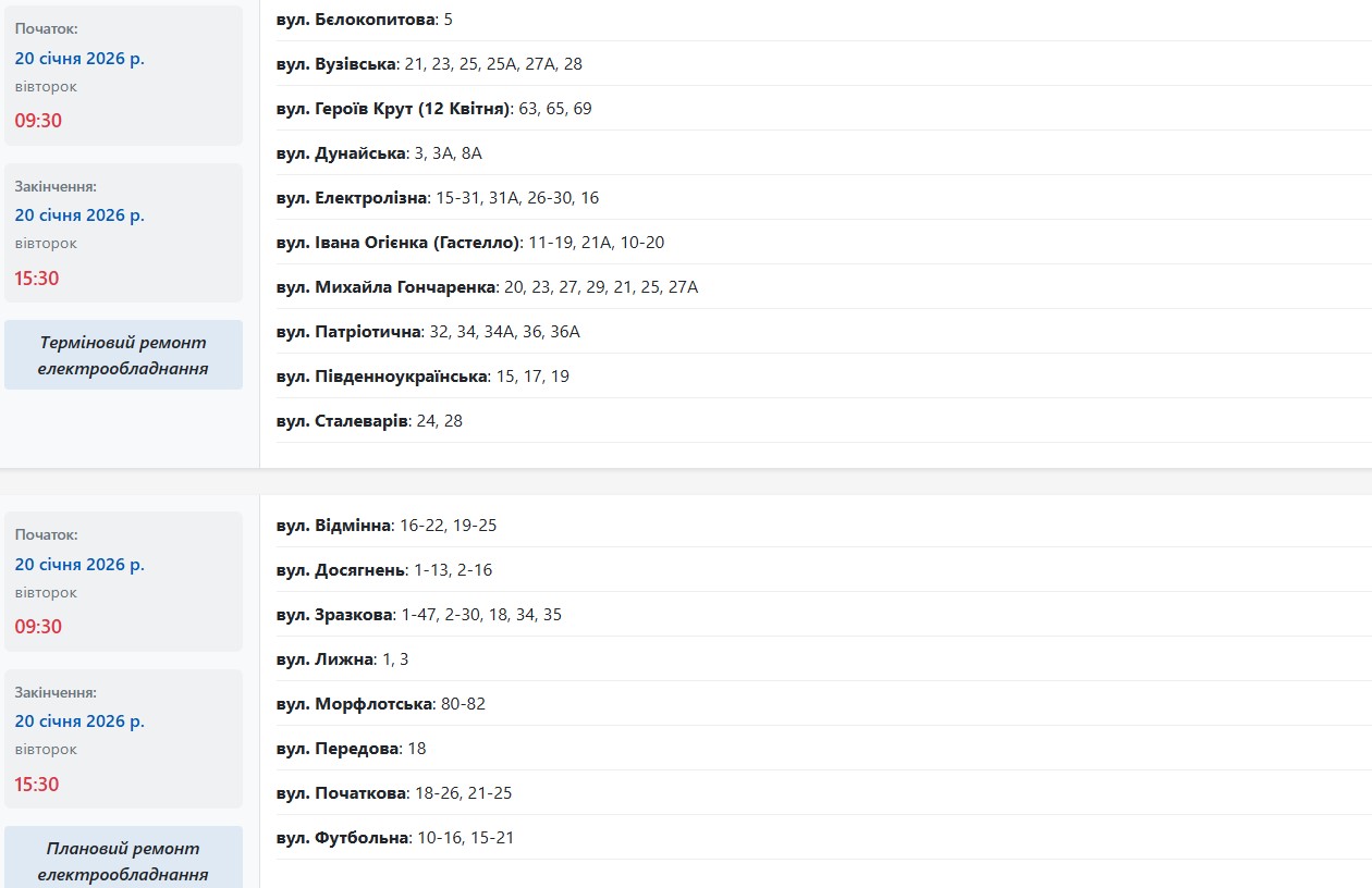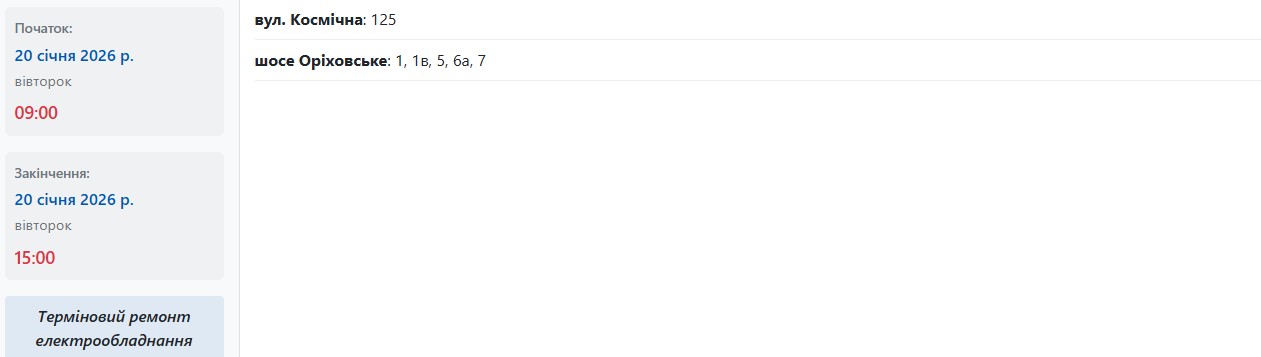 Нагадаємо, у вівторок, 20 січня, жителі Запорізької області перебуватимуть без світла від 12 до 14,5 години.
