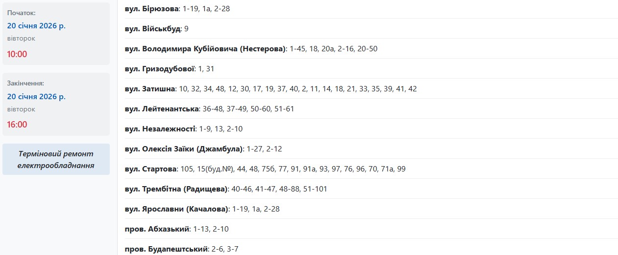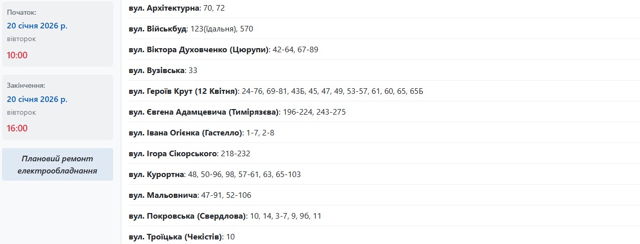 За даними енергетиків, у період із 09:00 до 15:30 електрообладнання ремонтуватимуть на наступних вулицях: