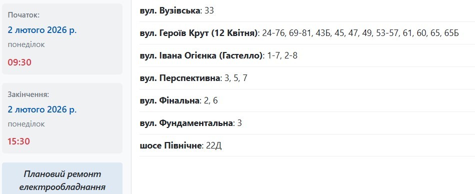 Зазначається, що з 09:30 до 15:30 електрики не буде в наступних будинках: