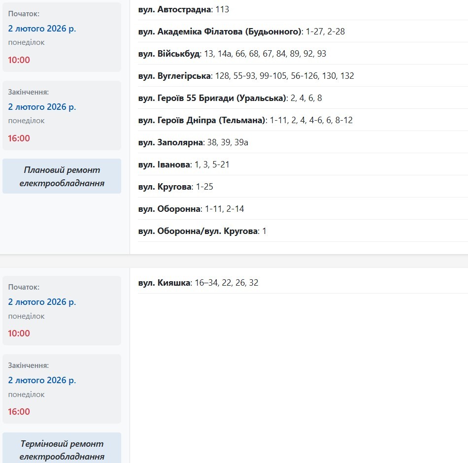 Також у період із 10:00 до 16:00 світло вимкнуть за адресами: