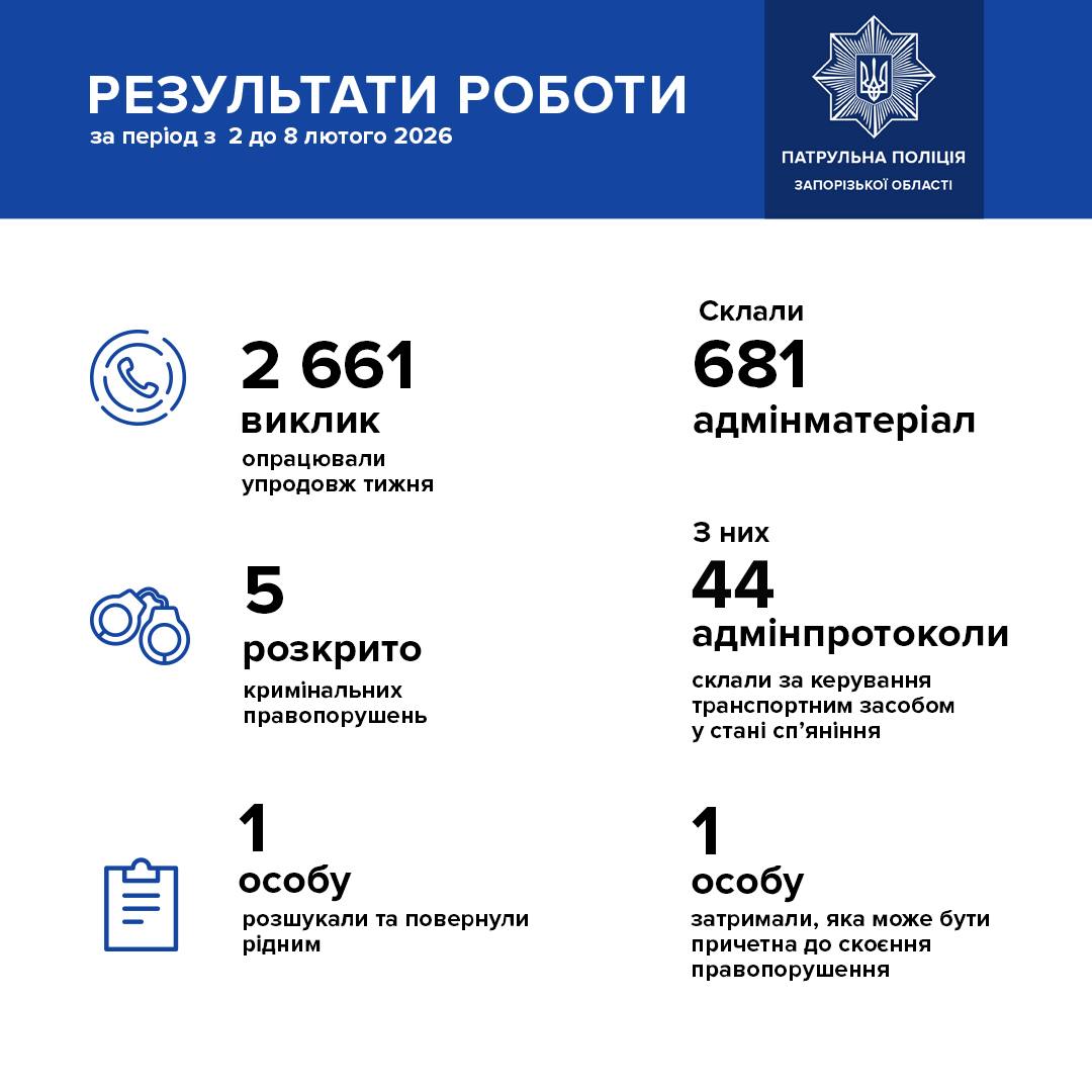 Упродовж тижня правоохоронці опрацювали 2 661 виклик і склали понад 680 адміністративних матеріалів. При цьому патрульні виявили понад 40 водіїв з ознаками спʼяніння.