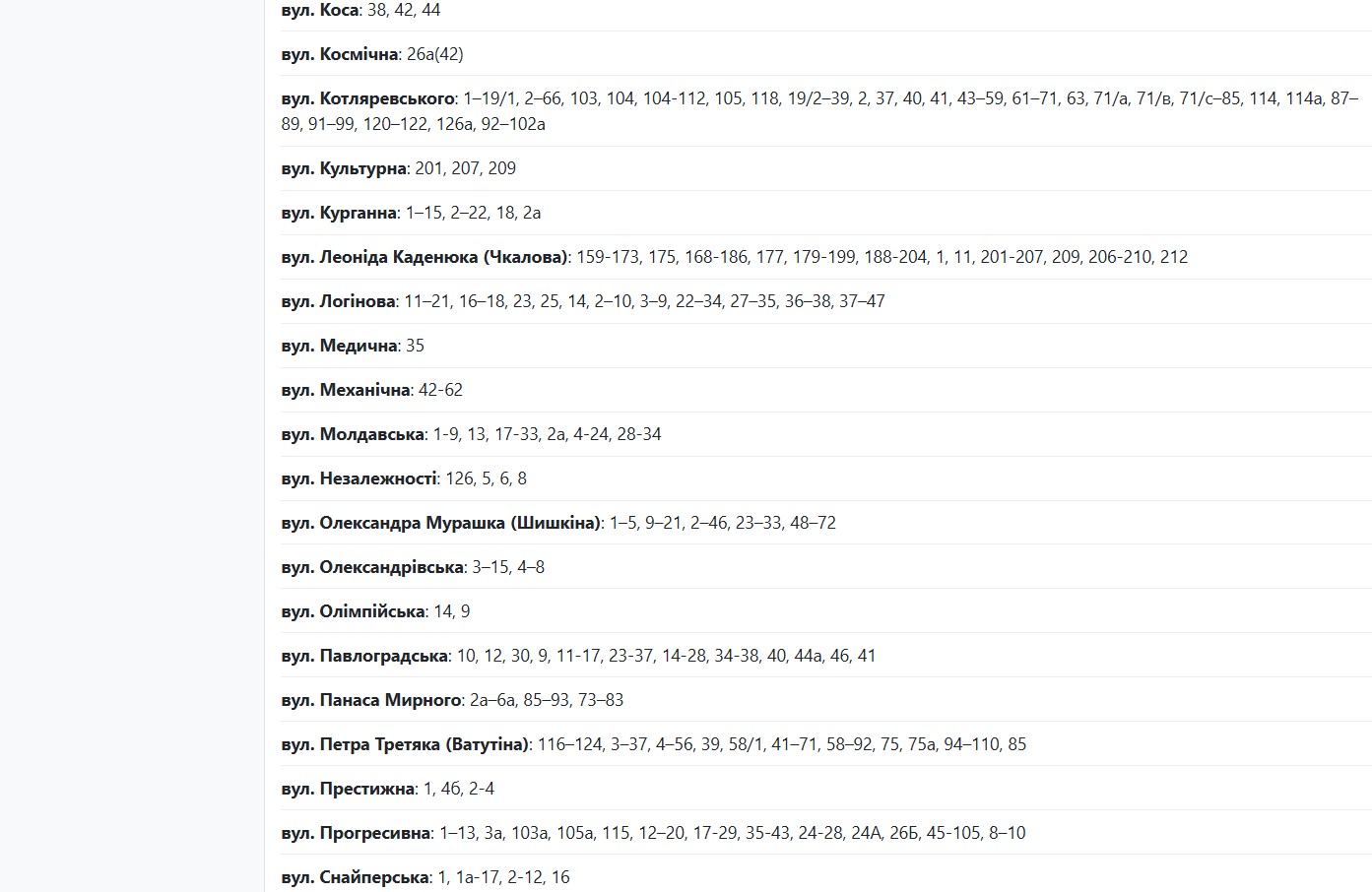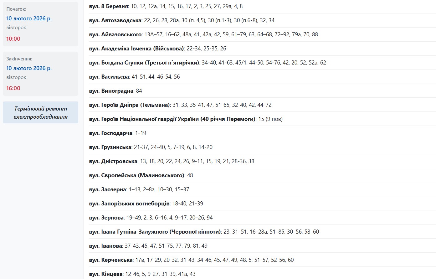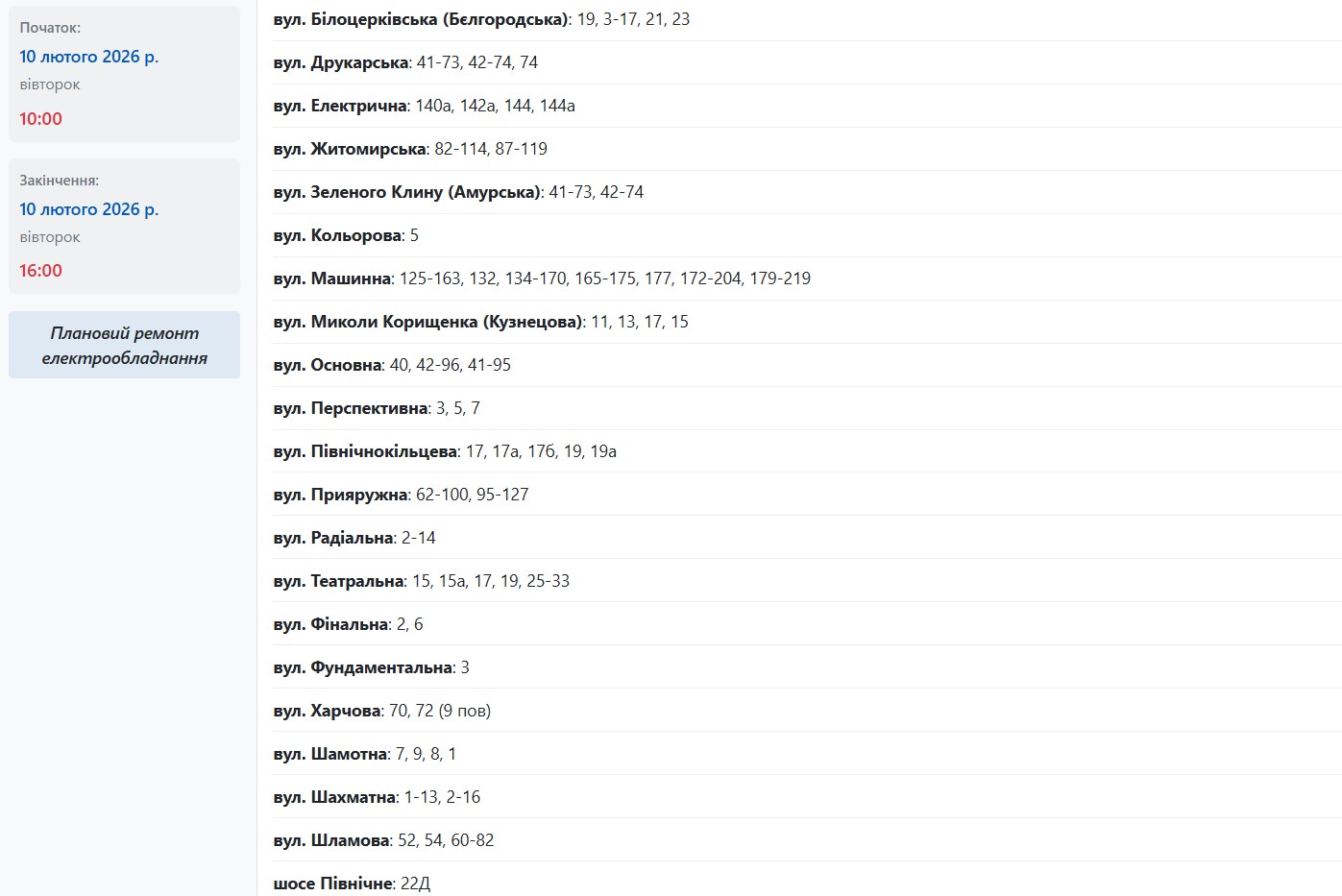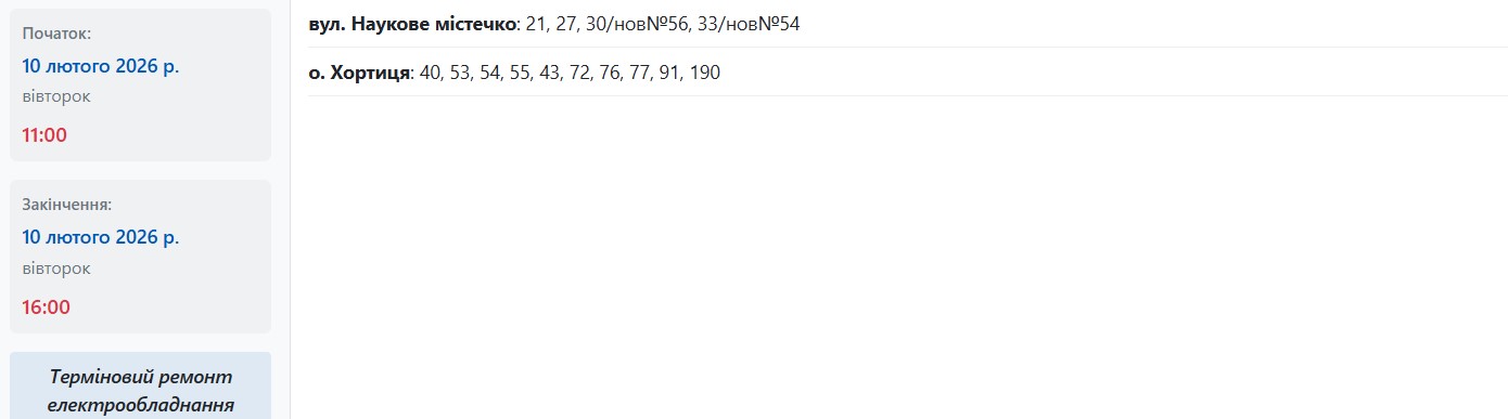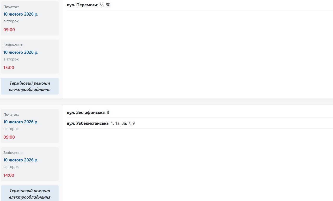 У період із 09:00 до 15:00 електрообладнання ремонтуватимуть на наступних вулицях: