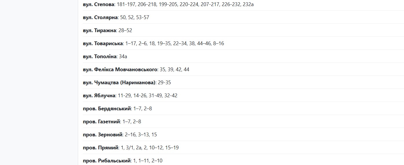 Окрім того, з 10:00 до 16:00 світло вимикатимуть за такими адресами: