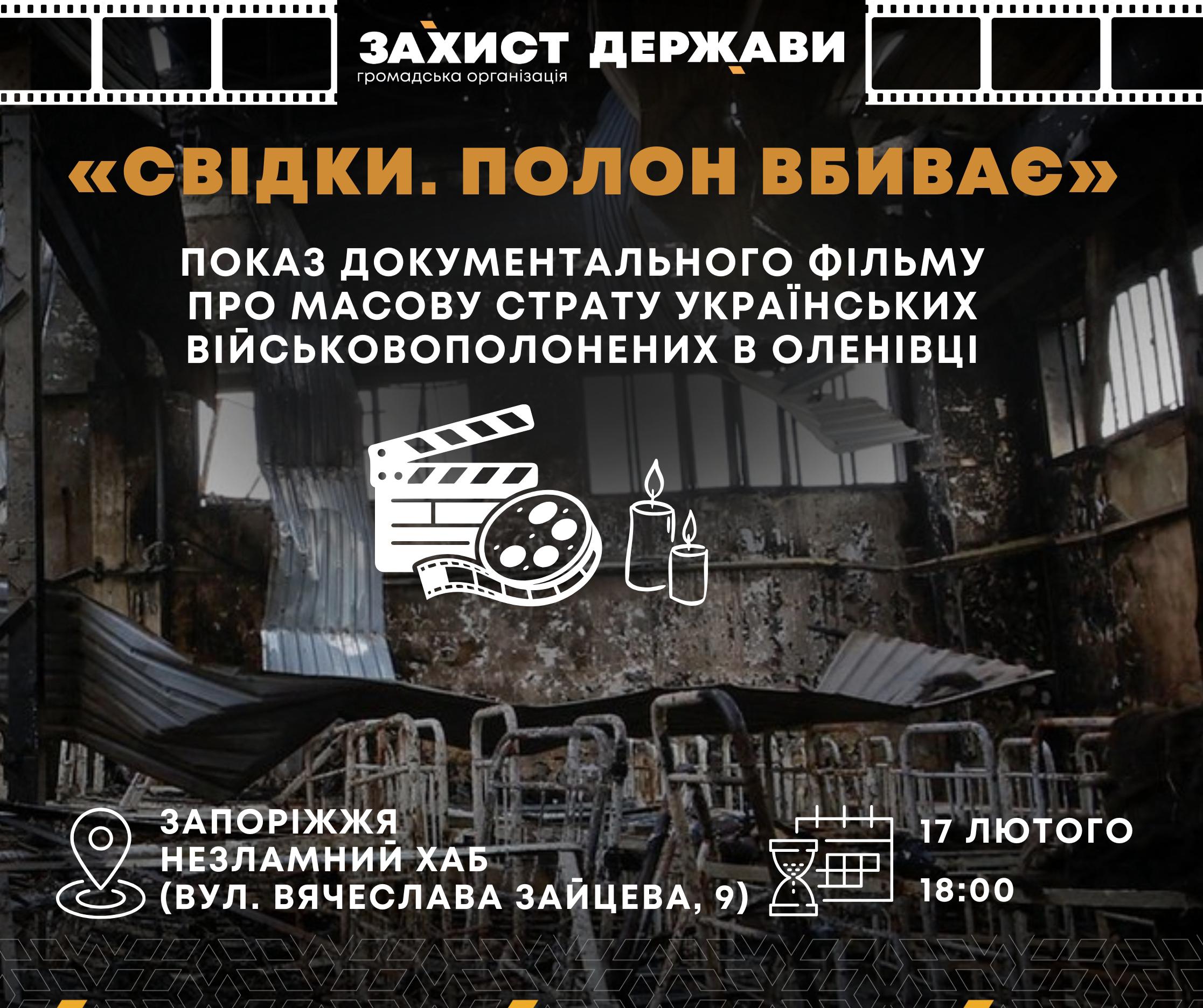 Запорізький осередок ГО "Захист держави" спільно з ГО "Спільнота Оленівки" (Olenivka Community) запрошує до перегляду документального фільму "Свідки. Полон вбиває", передає "Справжнє".