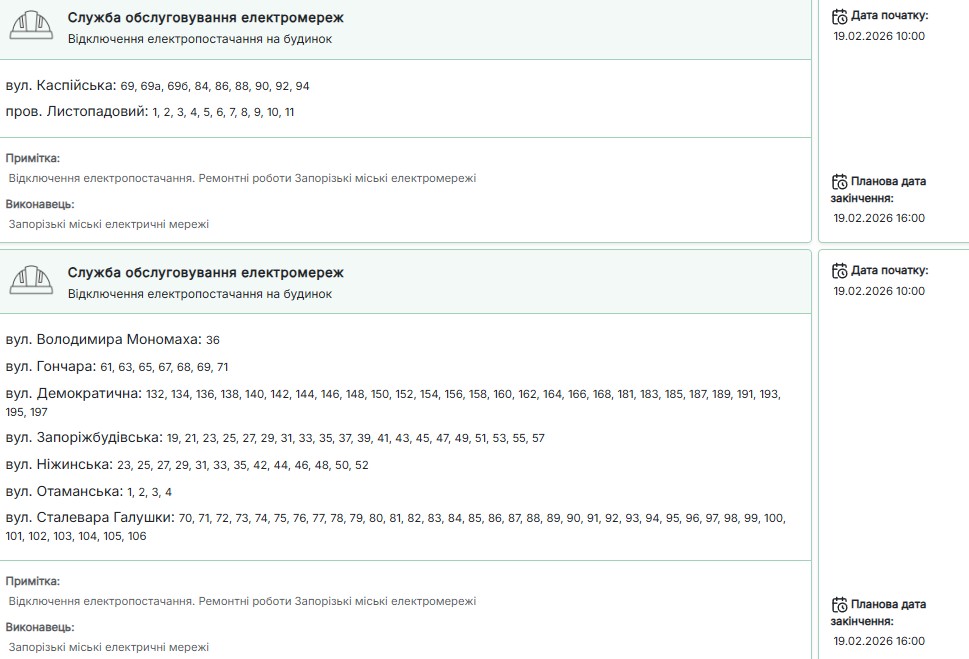 Понад 60 вулиць у різних районах Запоріжжя залишаться без електропостачання у четвер, 19 лютого. Про це повідомляє "Справжнє" з посиланням на міський контакт-центр "15-80".