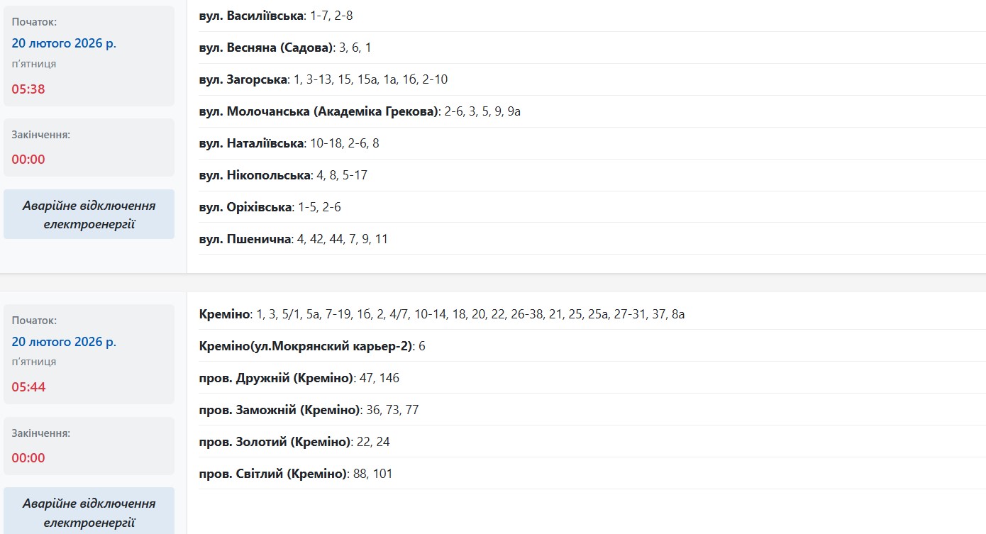 У п'ятницю, 20 лютого, декілька сотень житлових будинків на понад 120 вулицях Запоріжжя залишилися без світла. Про це повідомляє "Справжнє" з посиланням на Запоріжжяобленерго.