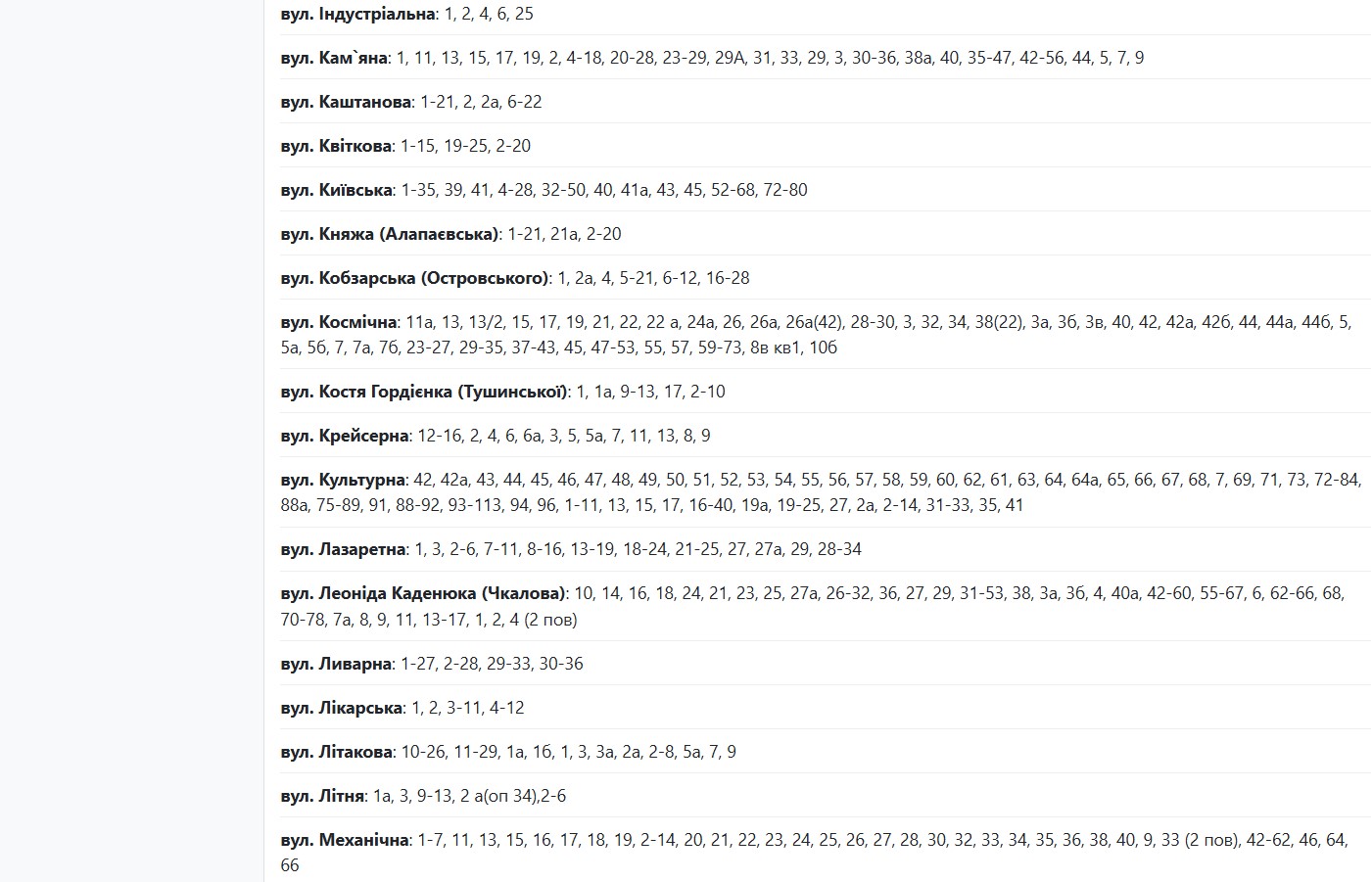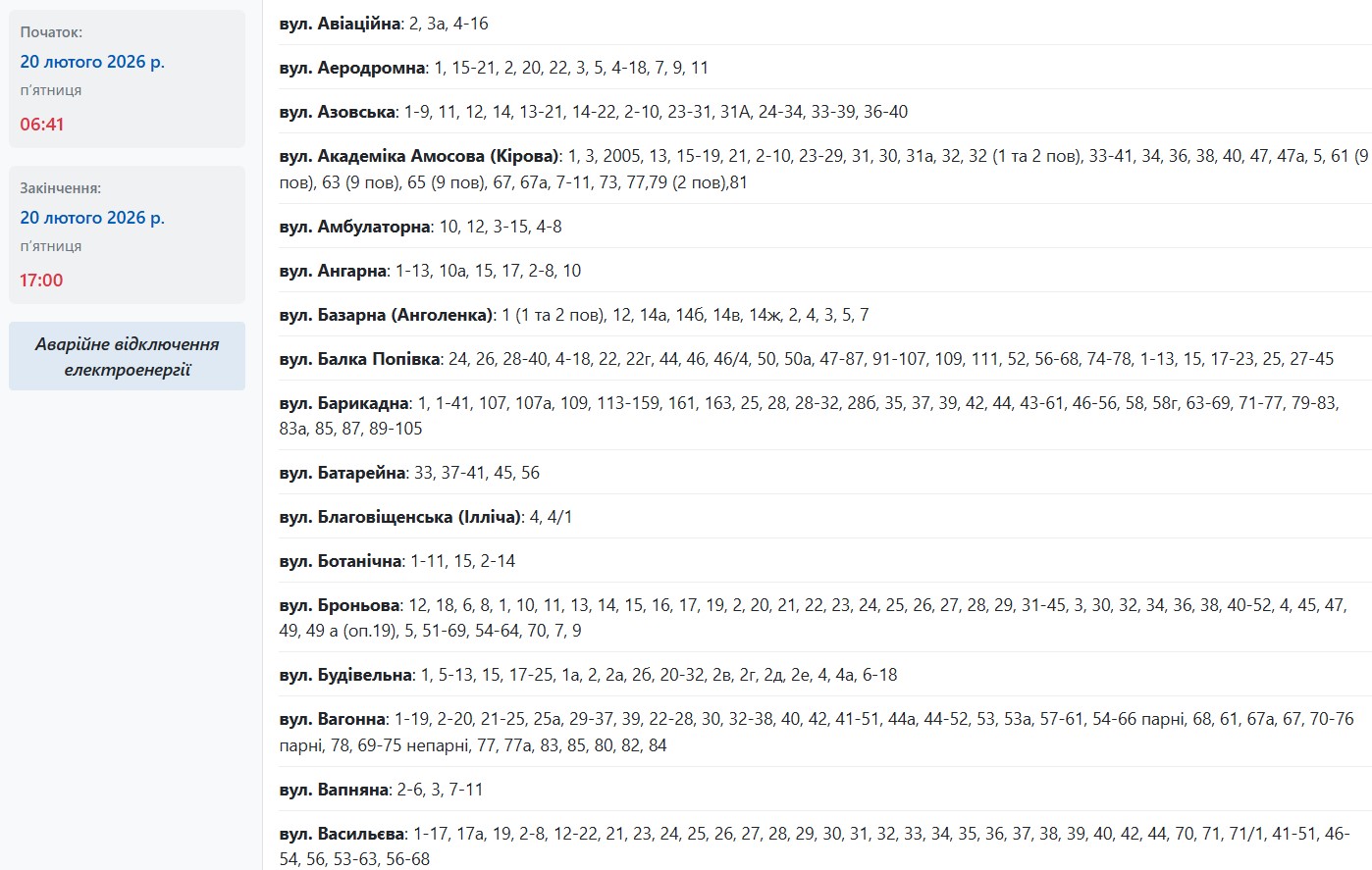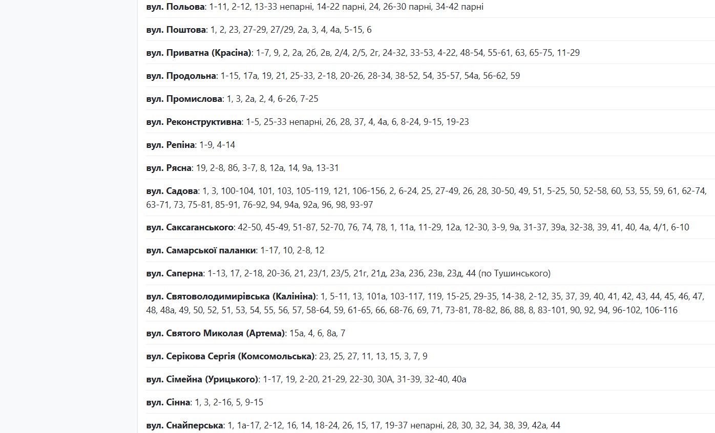 Аварійні відключення електроенергії сталися в кількох районах міста. Енергетики обіцяють відновити живлення близько 17:00 або до 00:00. Наразі без світла залишаються абоненти, які мешкають за адресами: