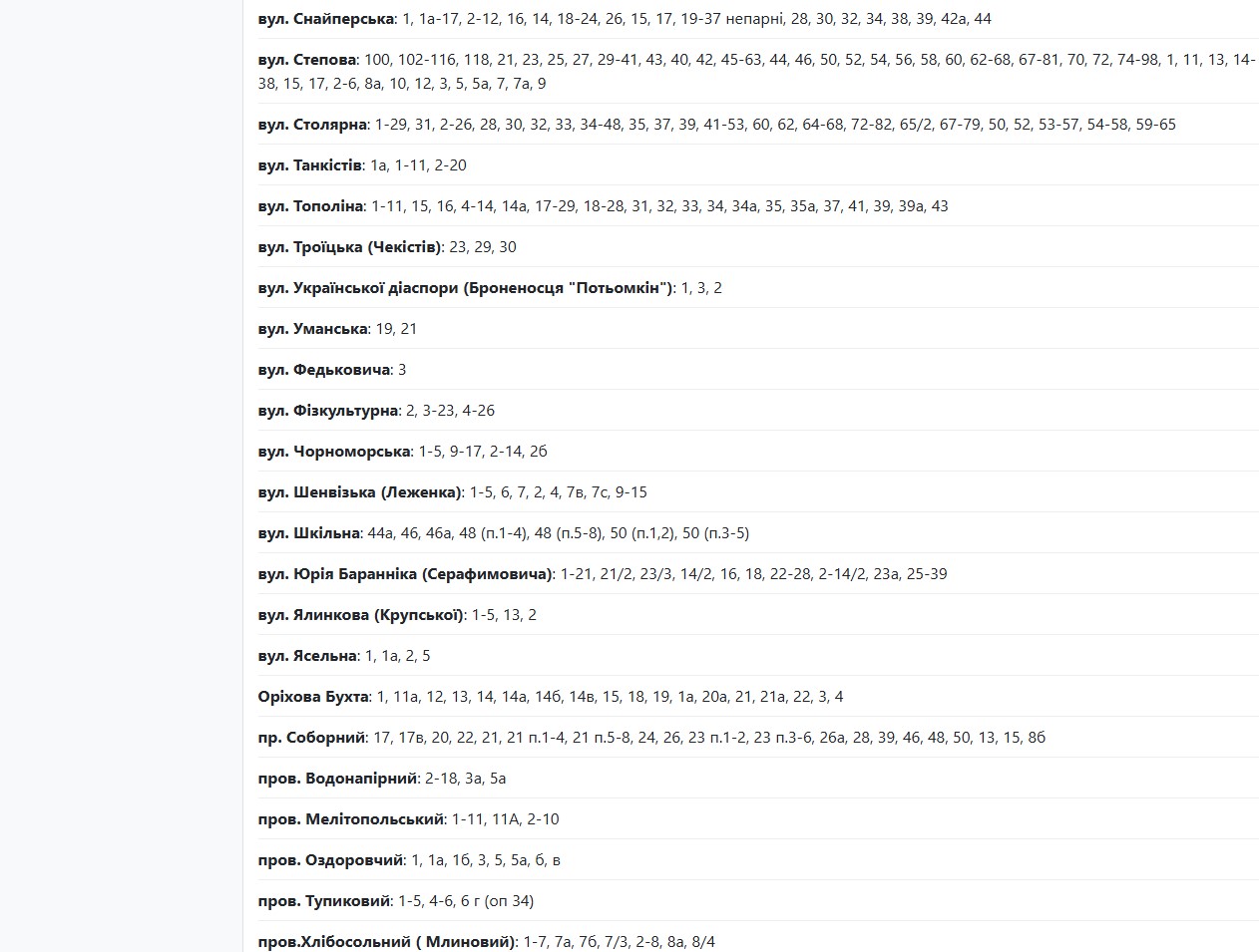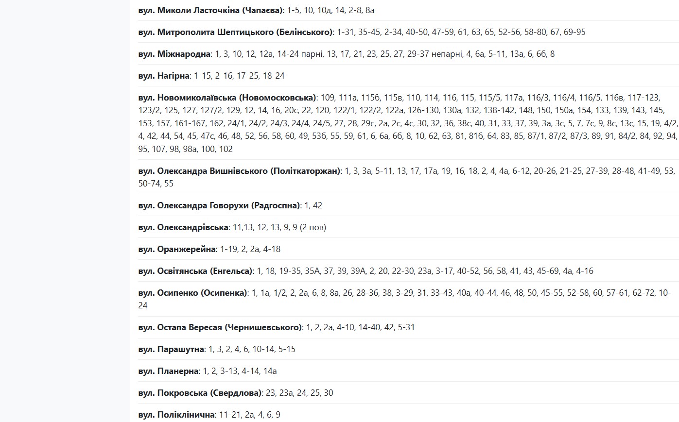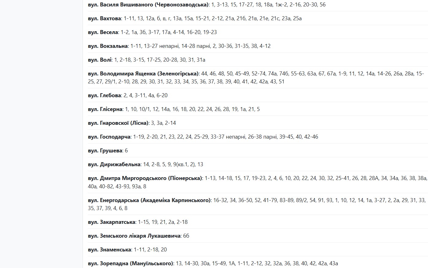 Аварійні відключення електроенергії сталися в кількох районах міста. Енергетики обіцяють відновити живлення близько 17:00 або до 00:00. Наразі без світла залишаються абоненти, які мешкають за адресами: