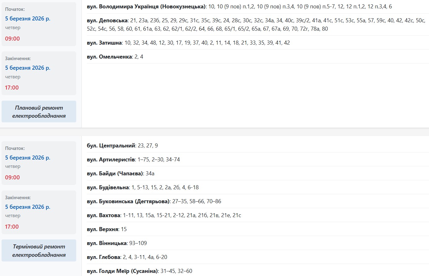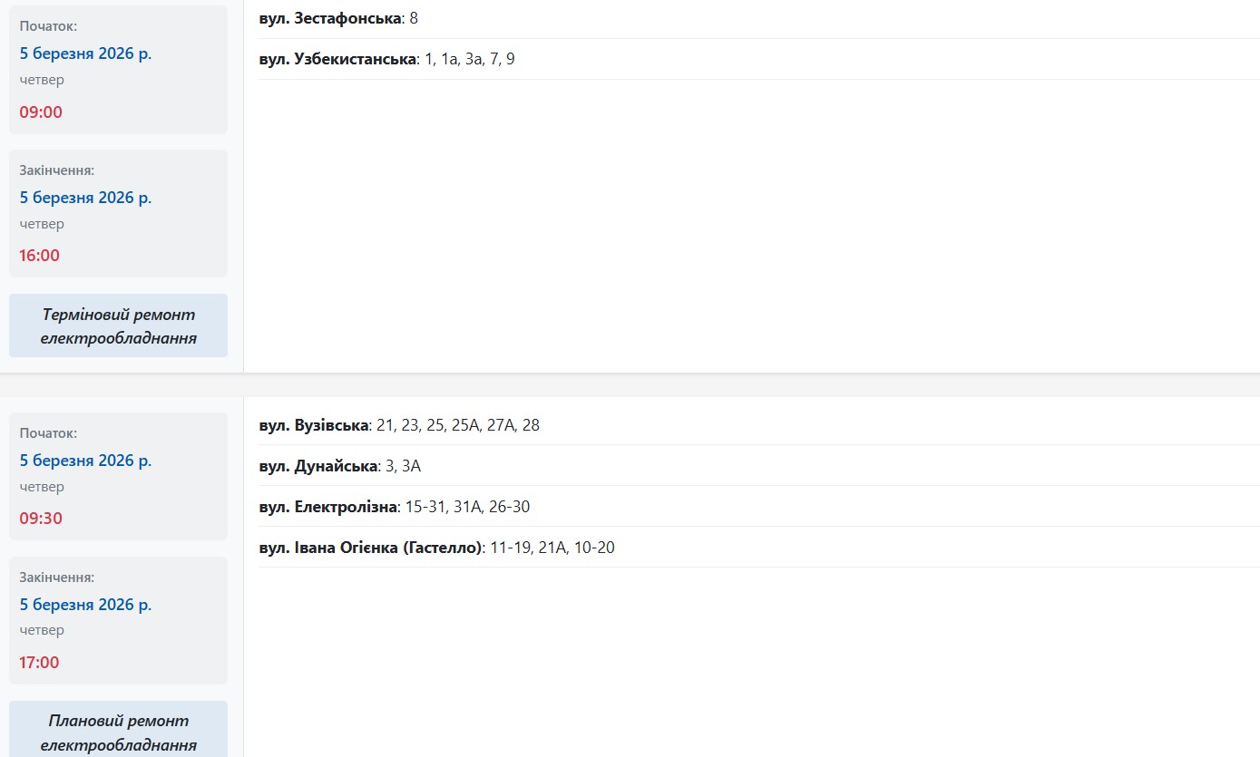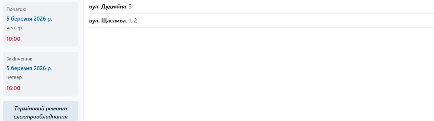 За наявними даними, у період із 09:00 до 17:00 енергетики вимкнуть світло за адресами: