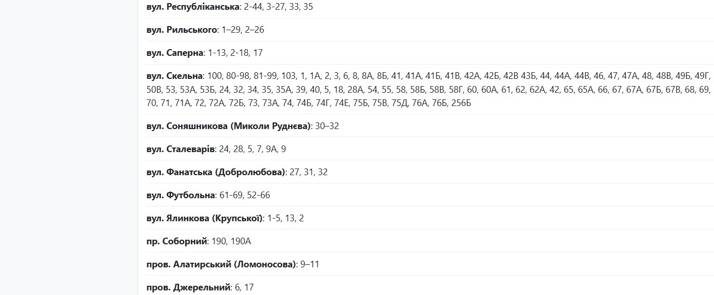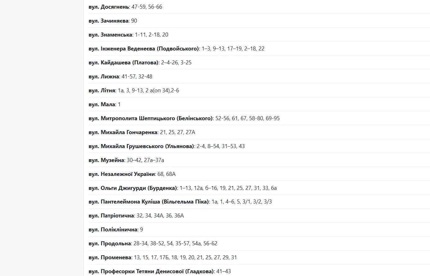 Також із 10:00 до 16:00 електрики не буде за такими адресами: