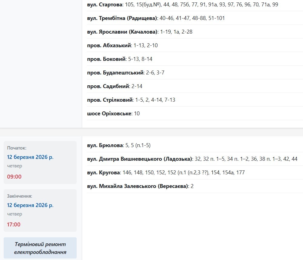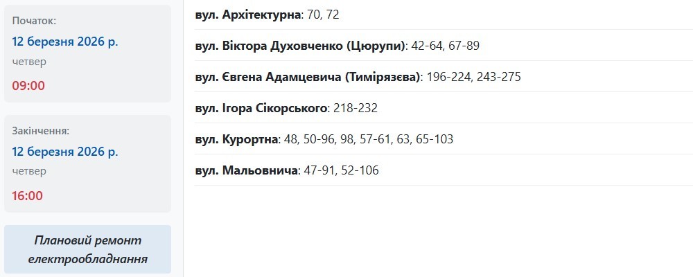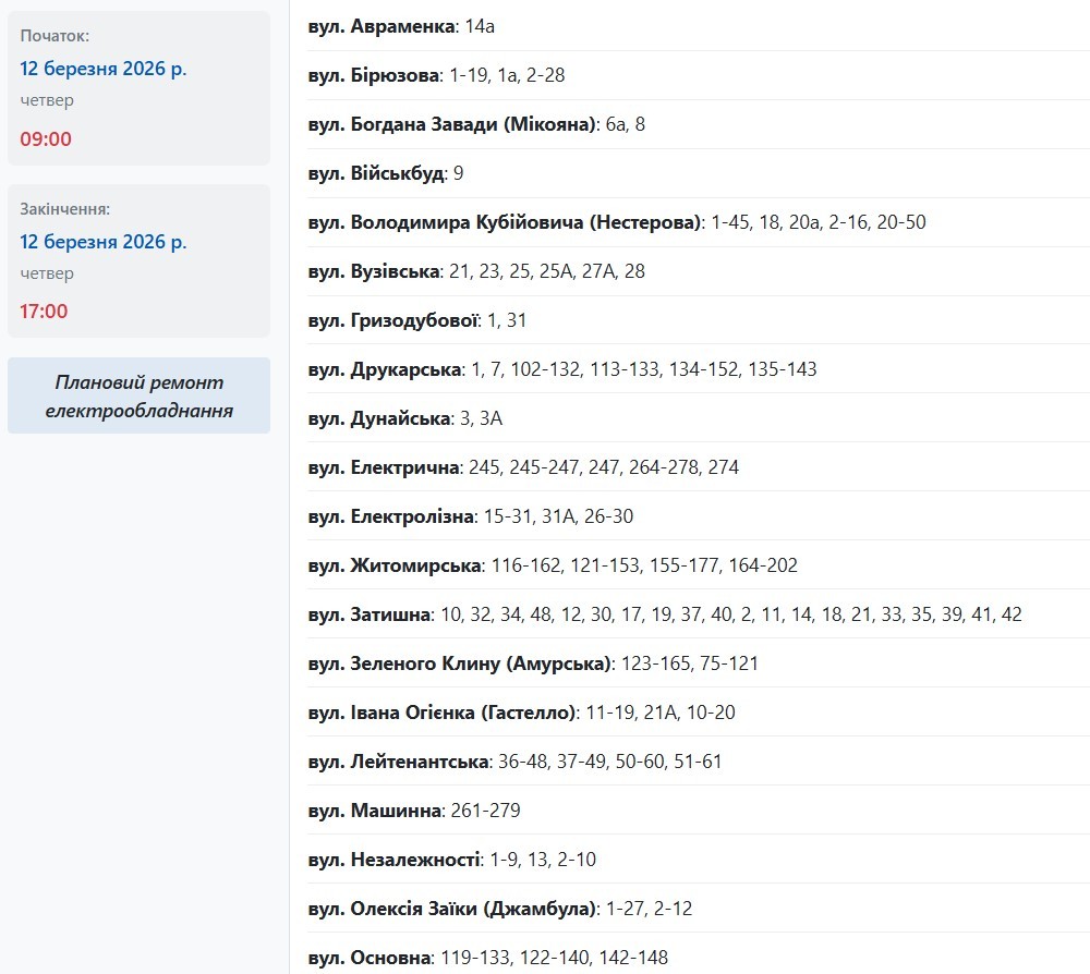 Також із 09:00 до 16:00 електрики не буде за такими адресами: