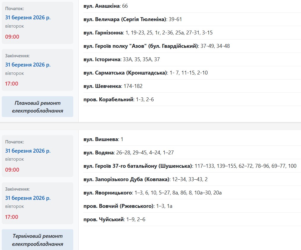У вівторок, 31 березня, у Запоріжжі знеструмлять близько 15 вулиць у різних районах міста. Про це повідомляє Запоріжжяобленерго, передає "Справжнє".