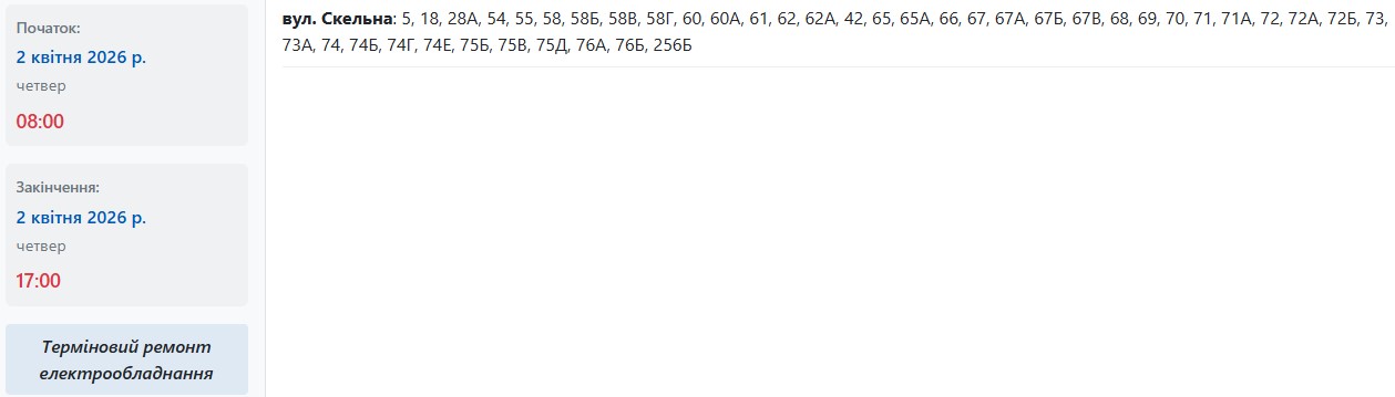 За наявними даними, у період із 08:00 до 17:00 енергетики вимикають світло за адресами:
