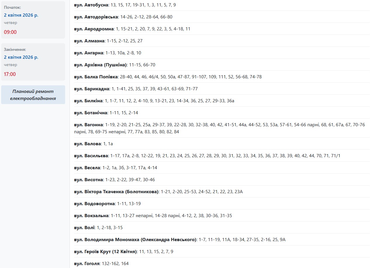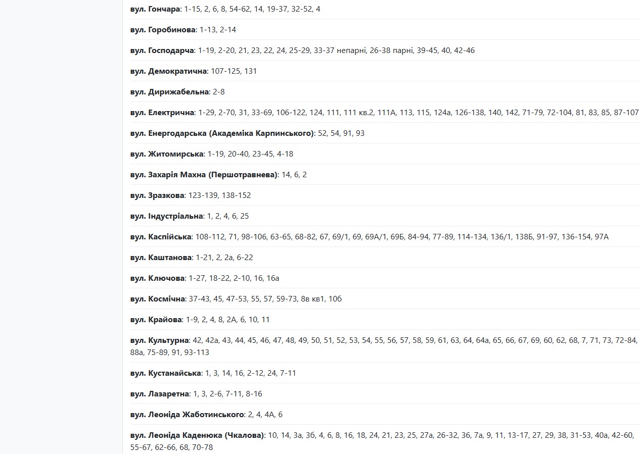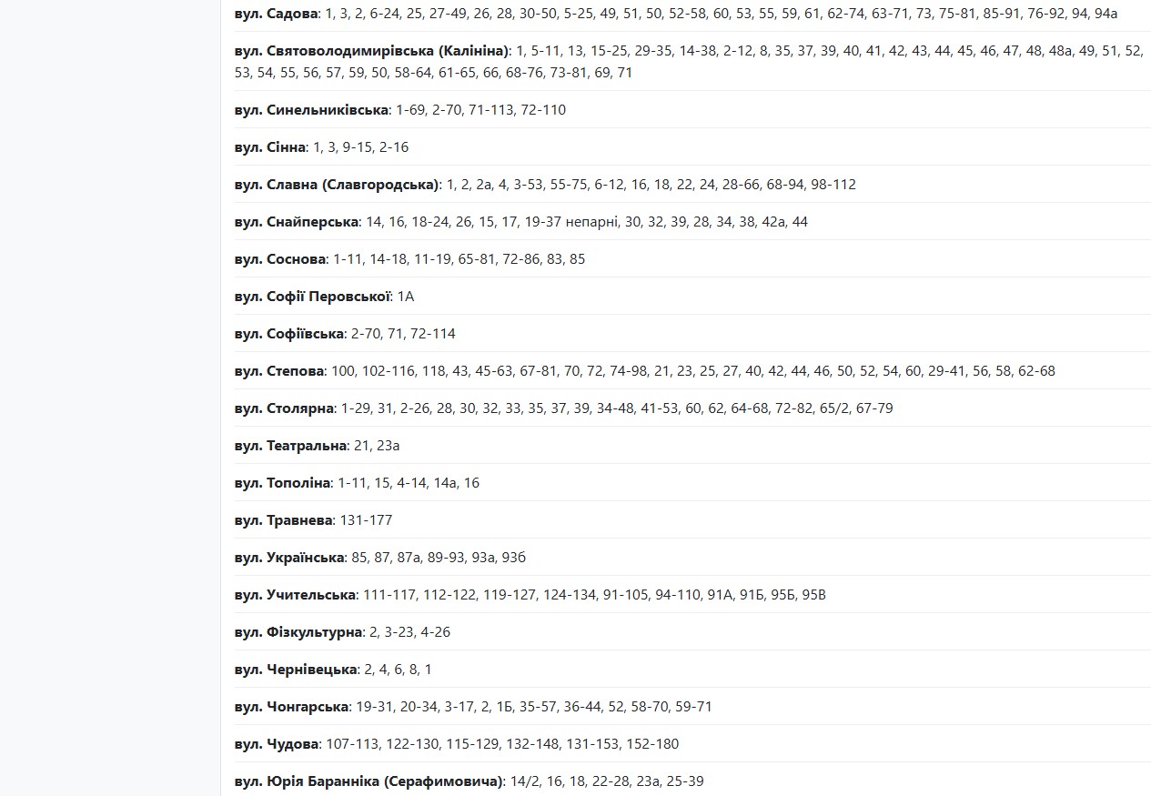 Також із 09:00 до 17:00 електрики не буде за такими адресами: