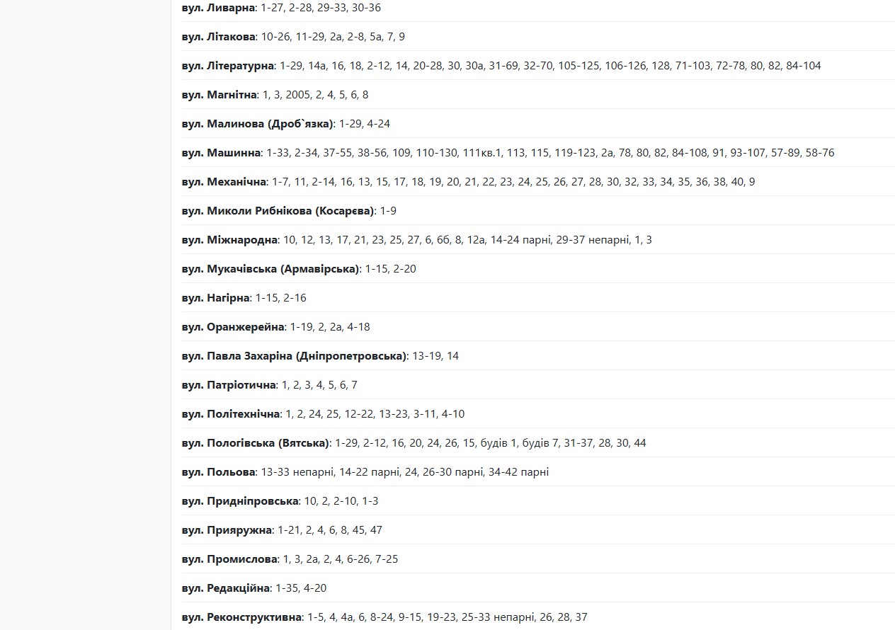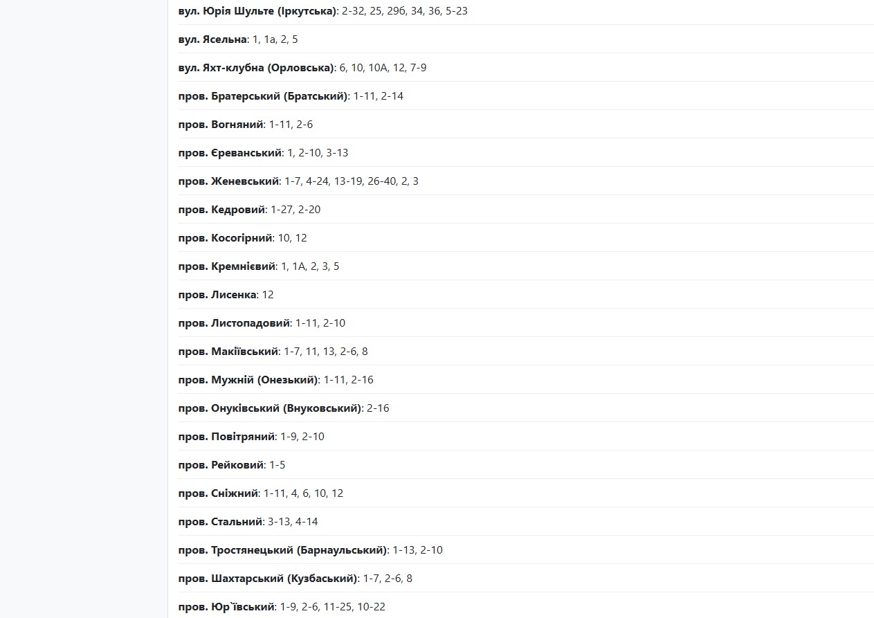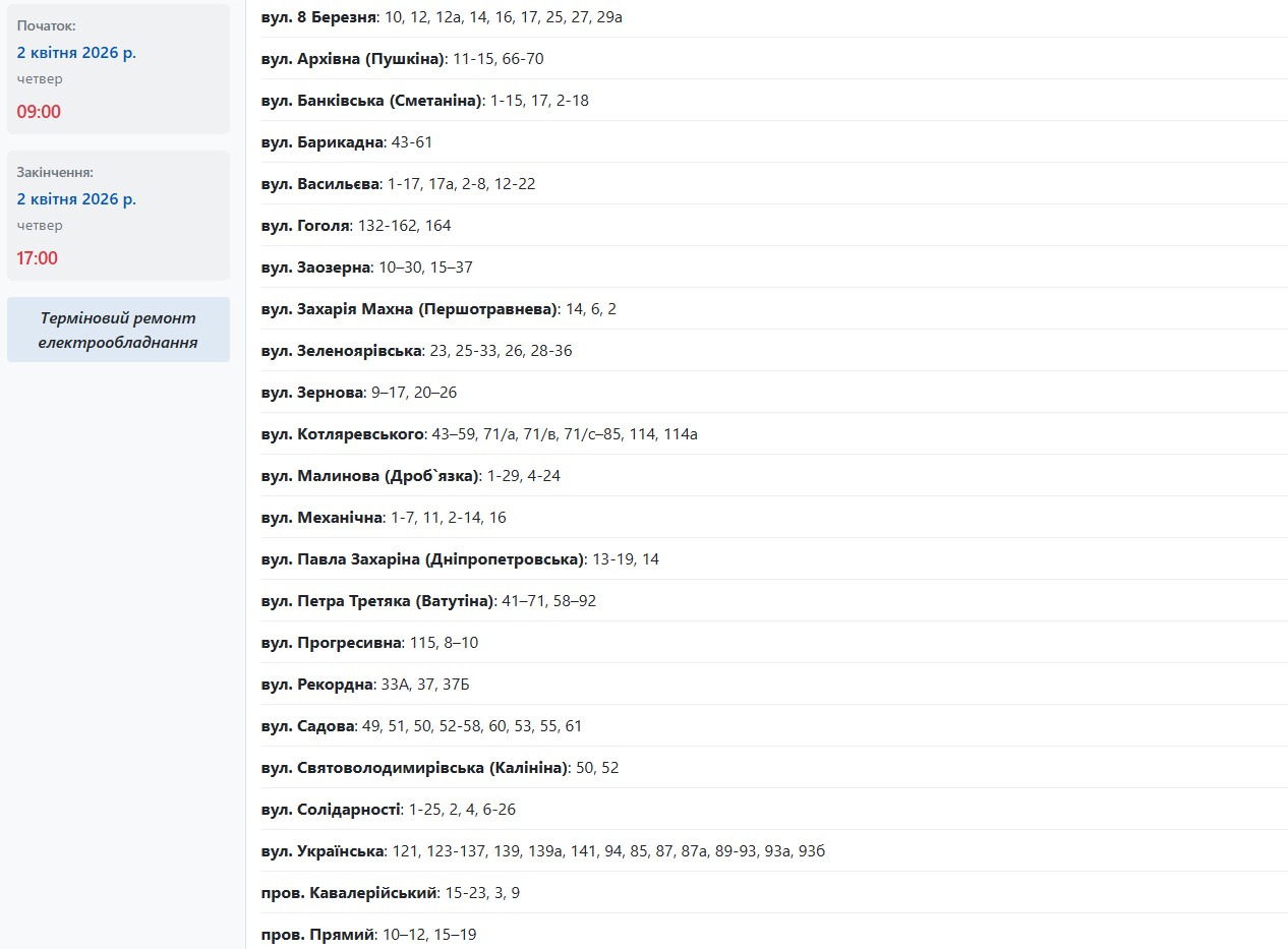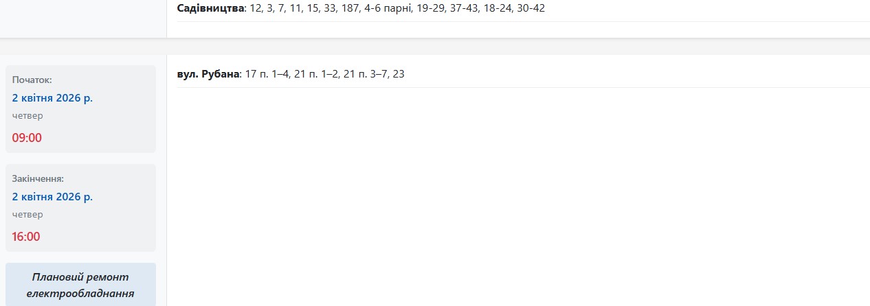 Також із 09:00 до 17:00 електрики не буде за такими адресами: