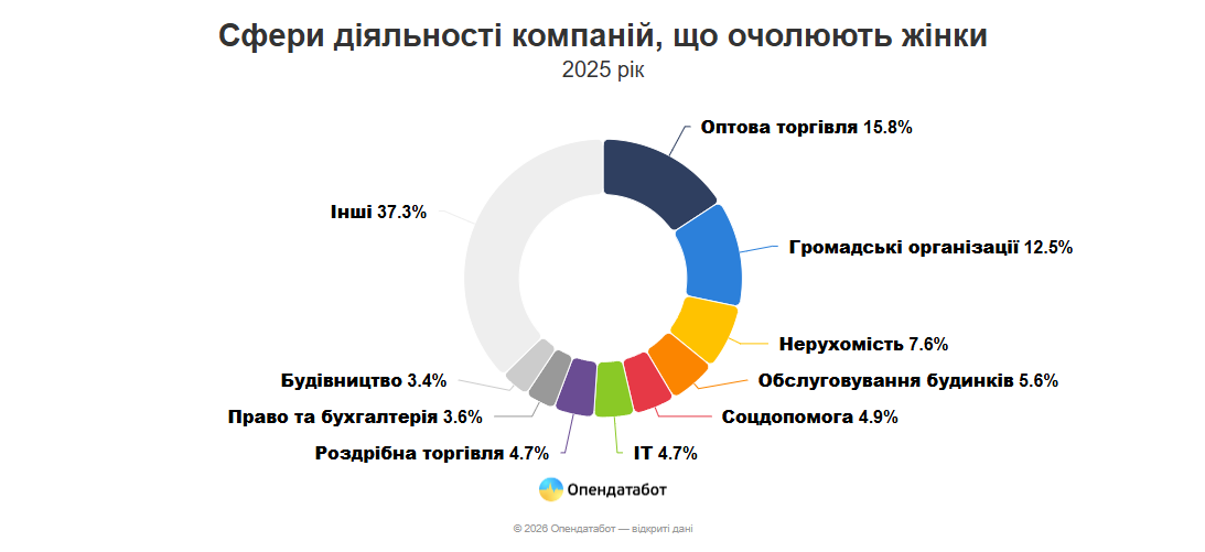 Найчастіше жінки відкривають бізнес у сфері оптової торгівлі, а також у громадському секторі, нерухомості, ІТ та будівництві. Водночас у туризмі, сфері мистецтва та HoReCa частка керівниць є найвищою.
