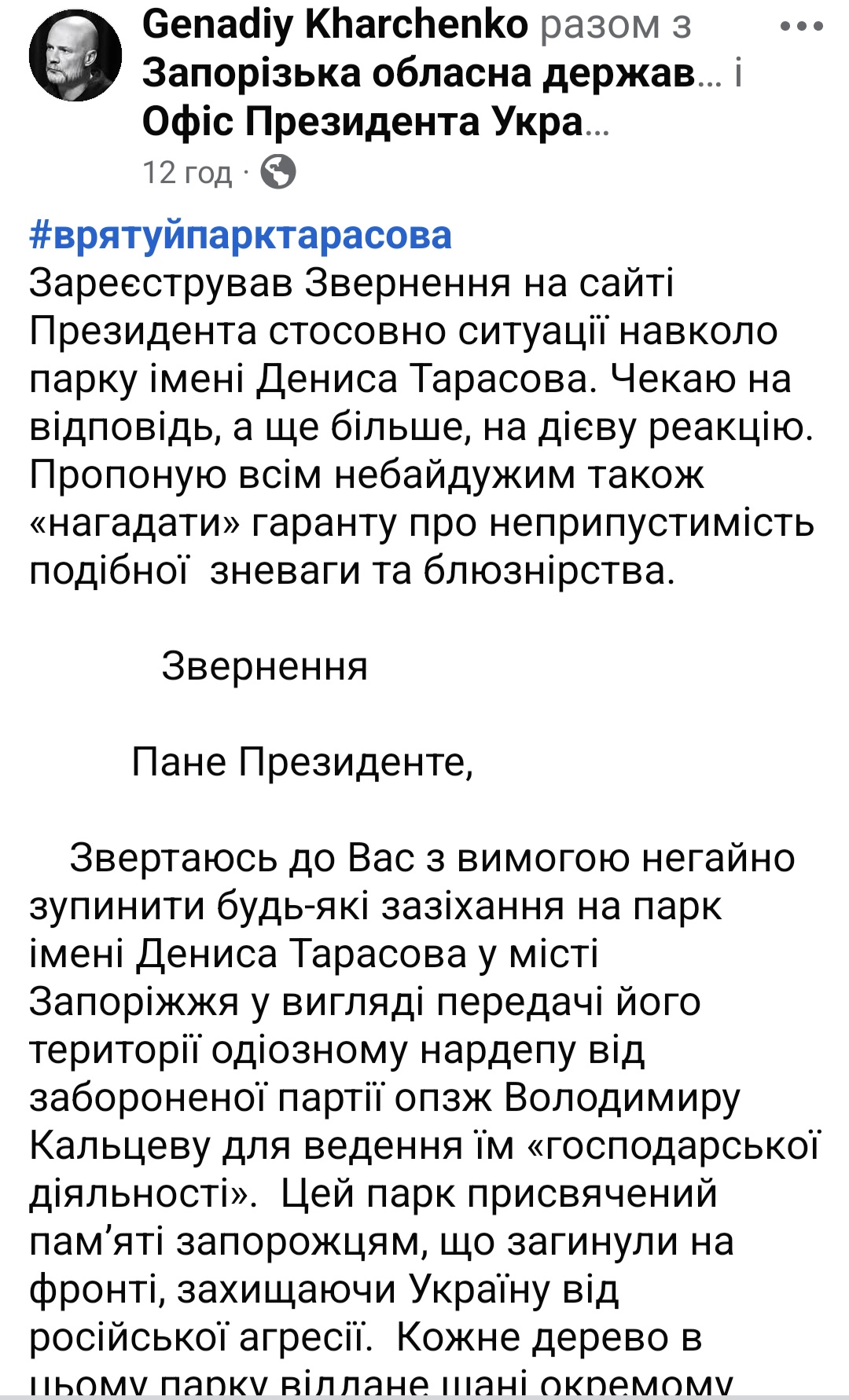 У зверненні він вимагає зупинити будь-які роботи чи рішення щодо території парку, переглянути право користування землею у разі її передачі, гарантувати збереження території як зеленої зони та місця пам’яті.