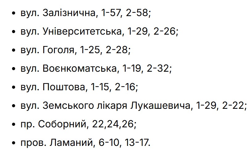 Для забезпечення мешканців питною водою підвіз автоцистерною організували на вулицю Поштова, 2 та проспект Соборний, 22-24.