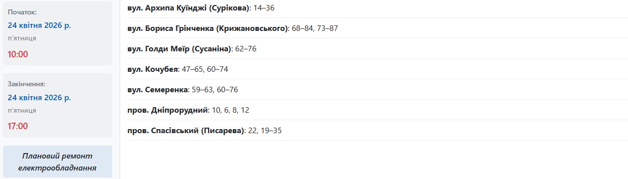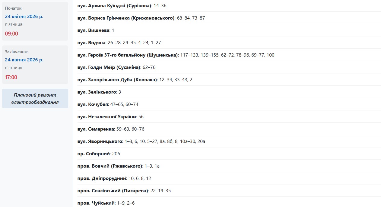 Будинки на майже 90 вулицях Запоріжжя залишаться без електропостачання у пʼятницю, 24 квітня, через плановий і терміновий ремонт електрообладнання. Про це повідомляє "Справжнє" з посиланням на Запоріжжяобленерго.