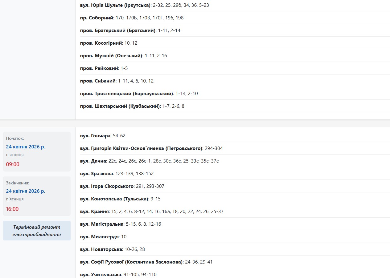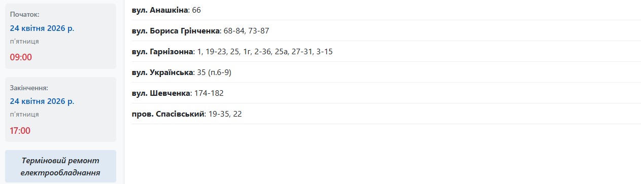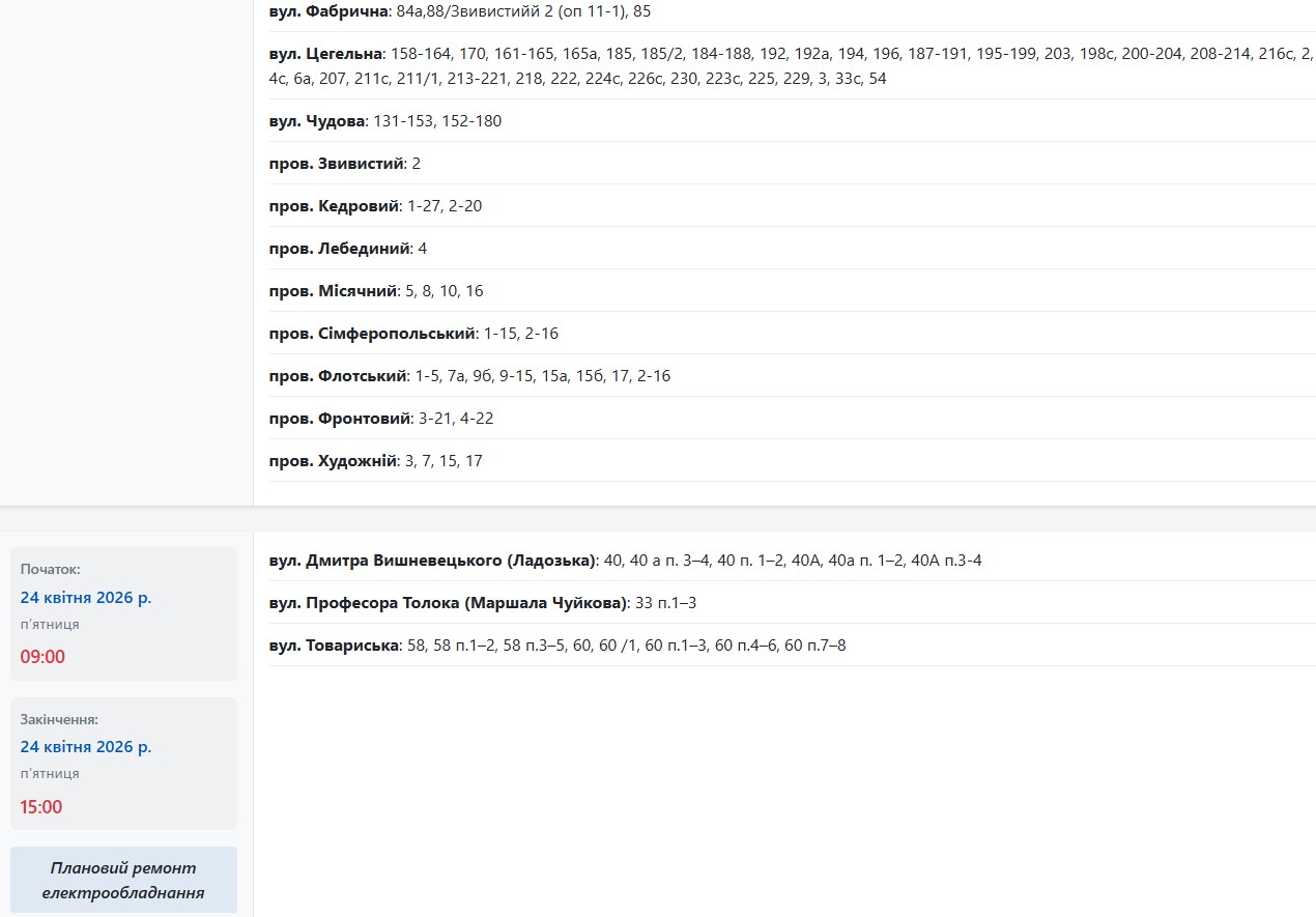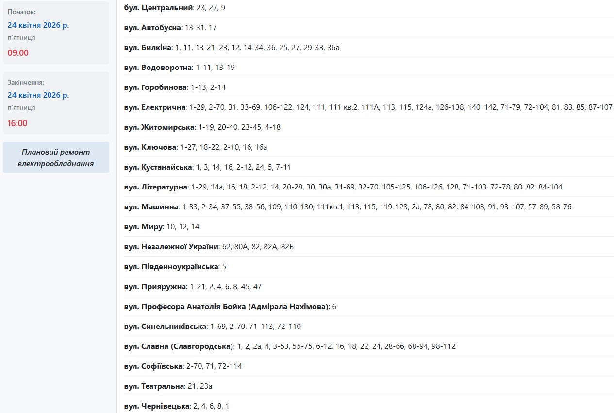 За наявною інформацією, впродовж доби ремонтні роботи проводитимуть за наступними адресами: