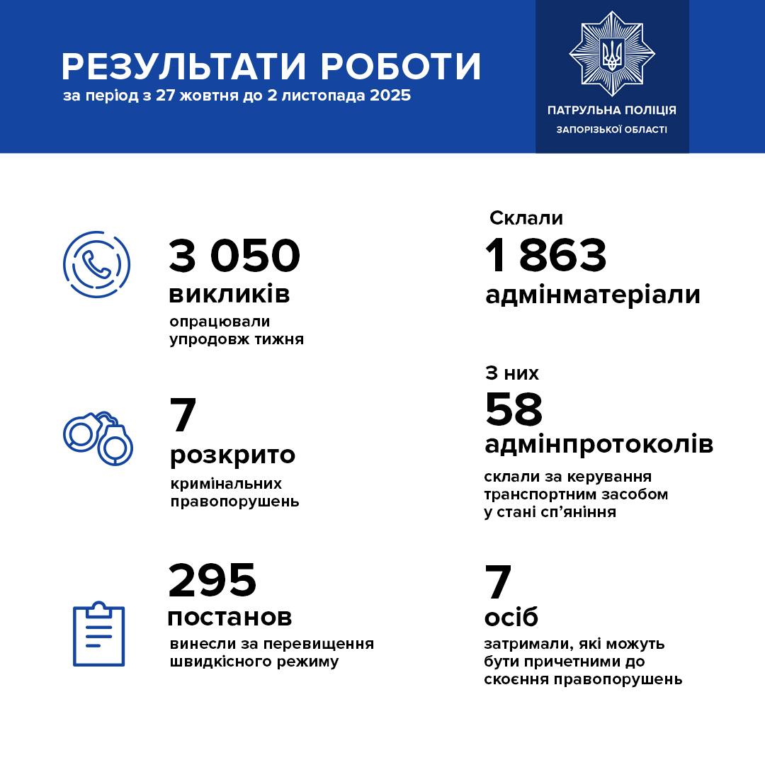 За минулий тиждень запорізькі інспектори повернули рідним трьох зниклих осіб, виявили майже 60 нетверезих водіїв, розкрили сім злочинів та допомагали людям під час обстрілів. Про це передає "Справжнє" з посиланням на патрульну поліцію.