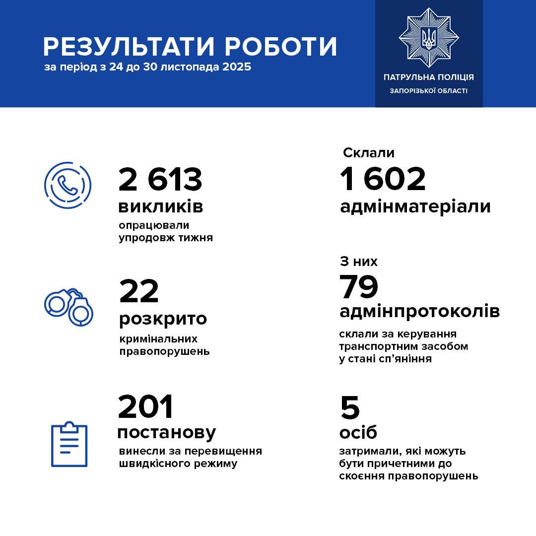 За минулий тиждень запорізькі інспектори повернули рідним двох зниклих осіб, виявили майже 80 нетверезих водіїв, розкрили два десятки злочинів та допомагали людям під час обстрілів. Про це передає "Справжнє" з посиланням на патрульну поліцію.