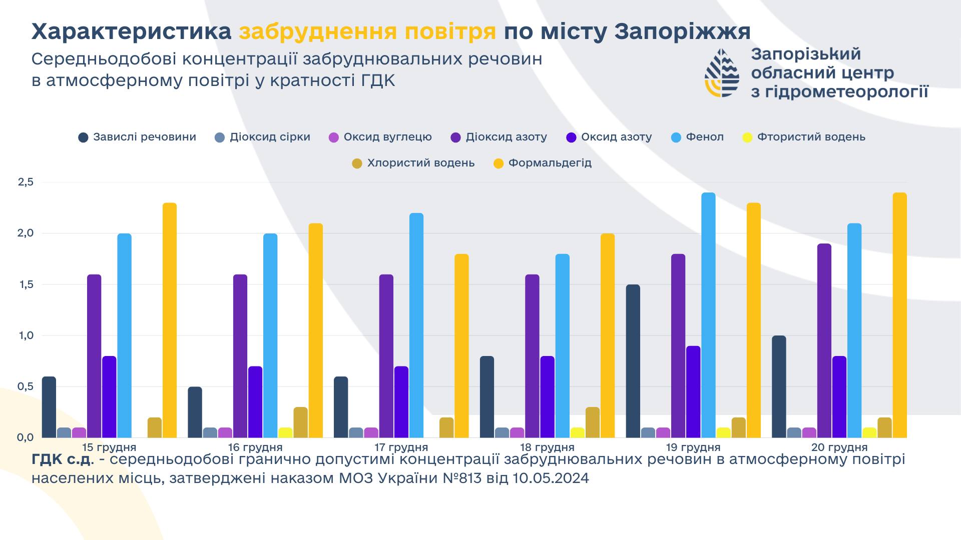 Тижневий моніторинг з 15 по 20 грудня показав перевищення середньодобових концентрацій забруднювальних речовин у повітрі, а саме: