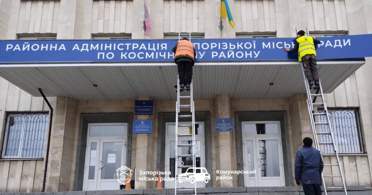 На будівлі районної адміністрації колишнього Комунарського району змінили вивіску, повідомляє "Справжнє".