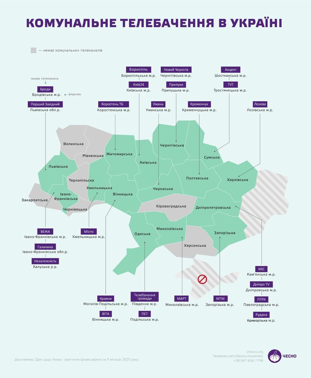 Загалом рух "Чесно" проаналізував роботу всіх 26 комунальних телеканалів в Україні, які фінансуються коштом місцевих бюджетів. Належать ці медіа двом обласним радам, семи обласним центрам і столиці.