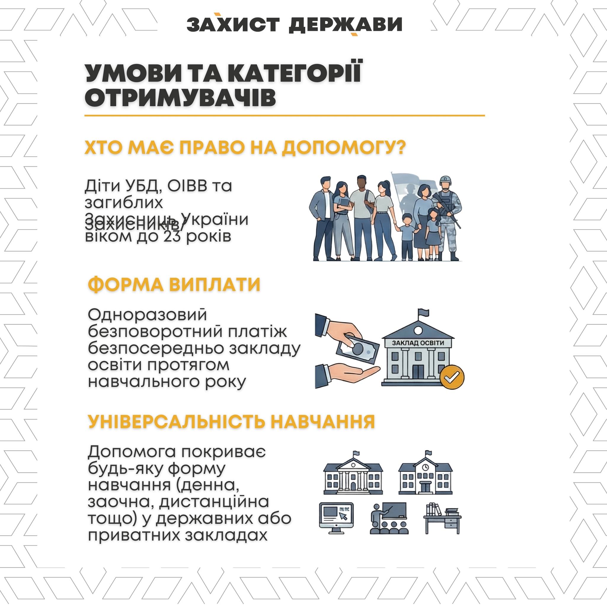 Допомога передбачена для дітей учасників бойових дій, осіб з інвалідністю внаслідок війни та загиблих Захисників. Йдеться про реальну компенсацію вартості навчання на контракті, незалежно від форми власності навчального закладу та форми навчання, яку обирає студент. Програму координують Міністерство у справах ветеранів, Міністерство освіти і науки та Міністерство цифрової трансформації.