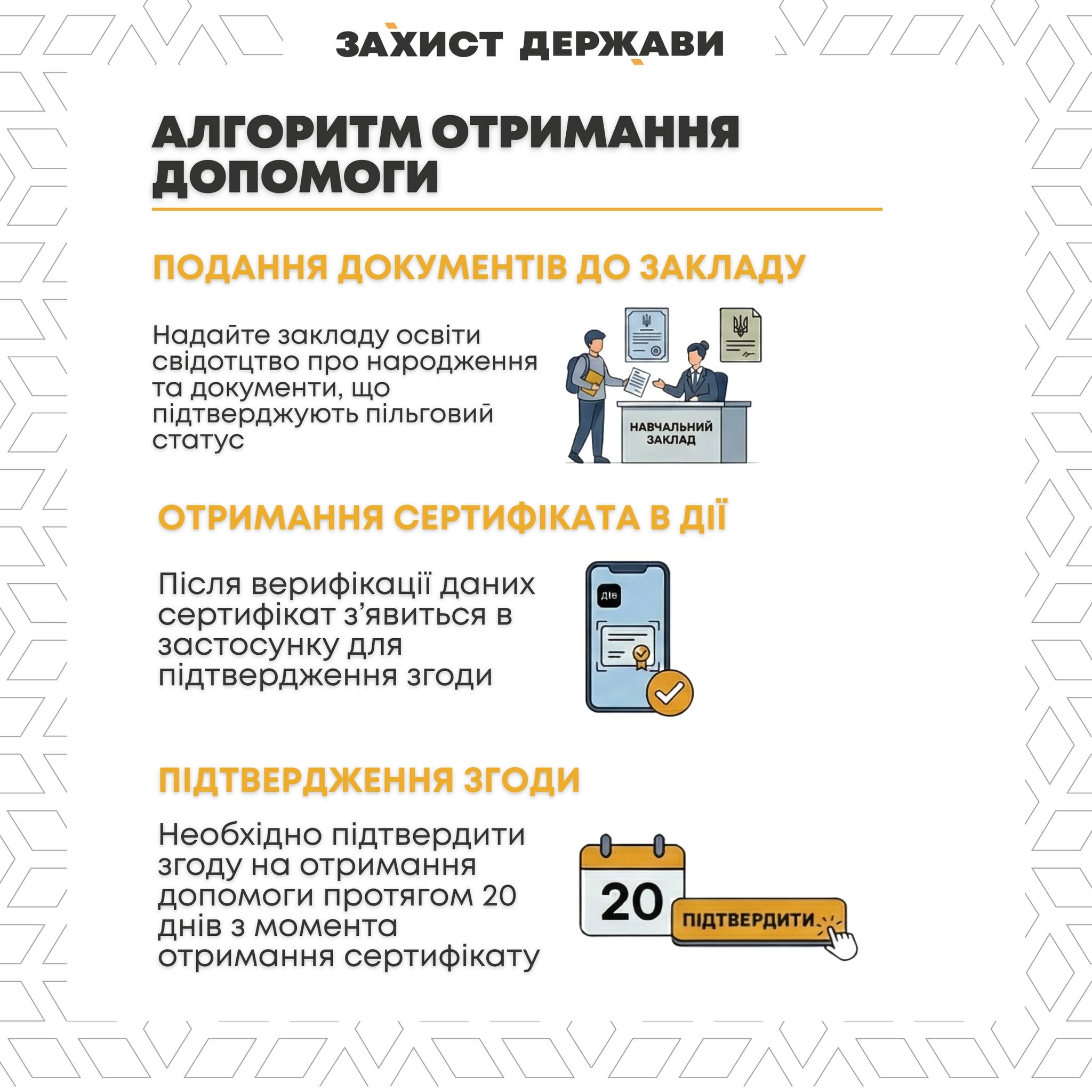 Після отримання сертифіката у вас є 20 днів, аби підтвердити згоду в "Дії”. Якщо не зробити у визначений строк, допомогу можуть анулювати.