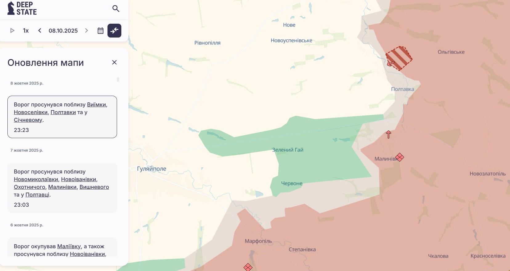 Окупаційна армія РФ просунулася поблизу села Полтавка (Олександрівський напрямок) Пологівського району Запорізької області. Про це в четвер, 9 жовтня, повідомив український аналітичний проєкт DeepState, передає "Справжнє".