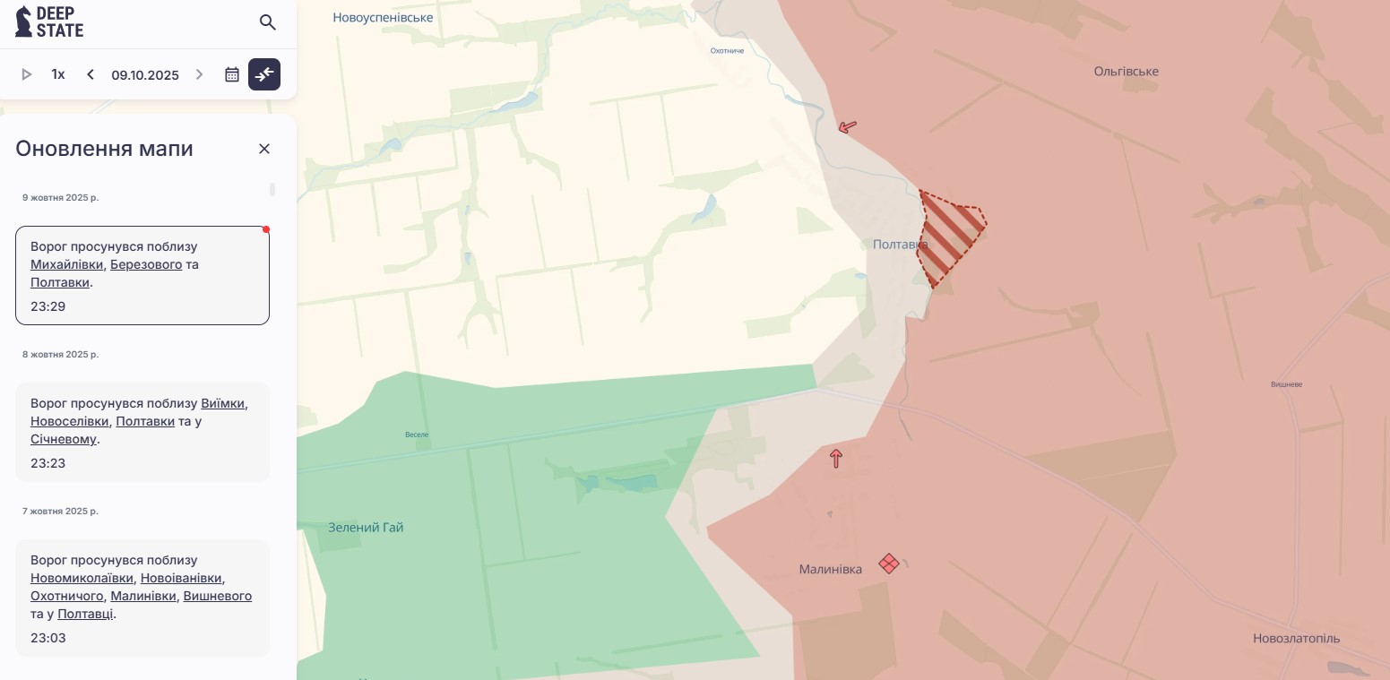 Крім того, за інформацією українських аналітиків, станом на 9 жовтня агресор просунувся біля сіл Березове Дніпропетровської області та Михайлівка Донецької області.