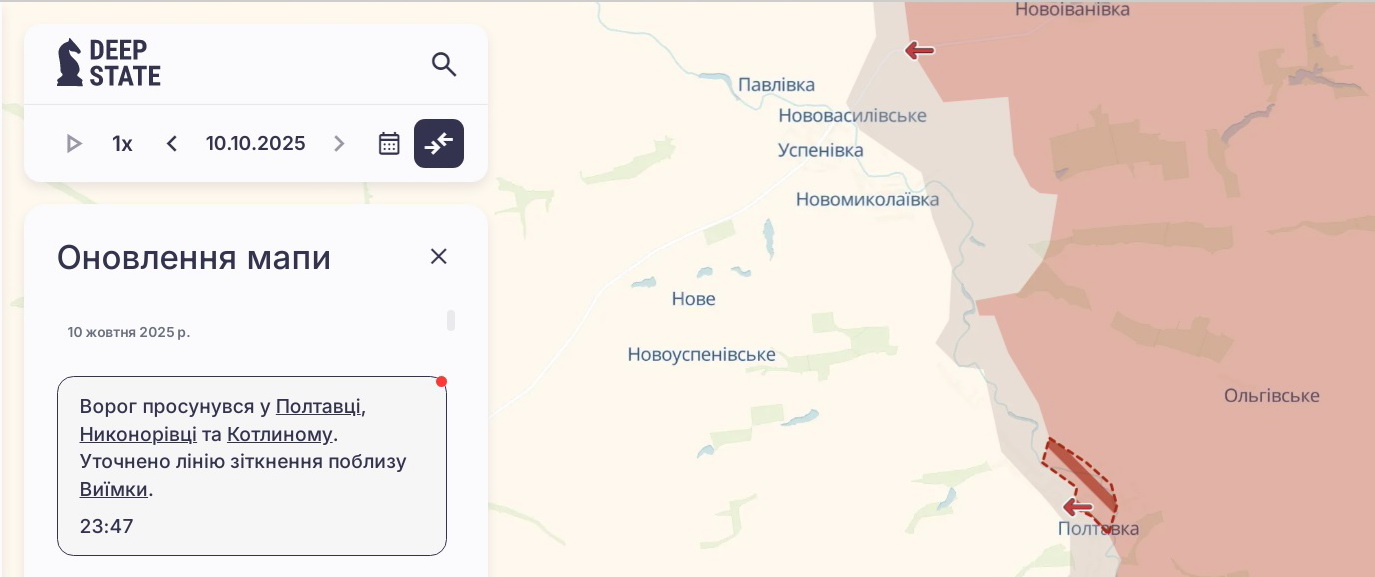 Аналітики українського проєкту DeepState констатують просування ворога в селі Полтавка Пологівського району, передає "Справжнє".