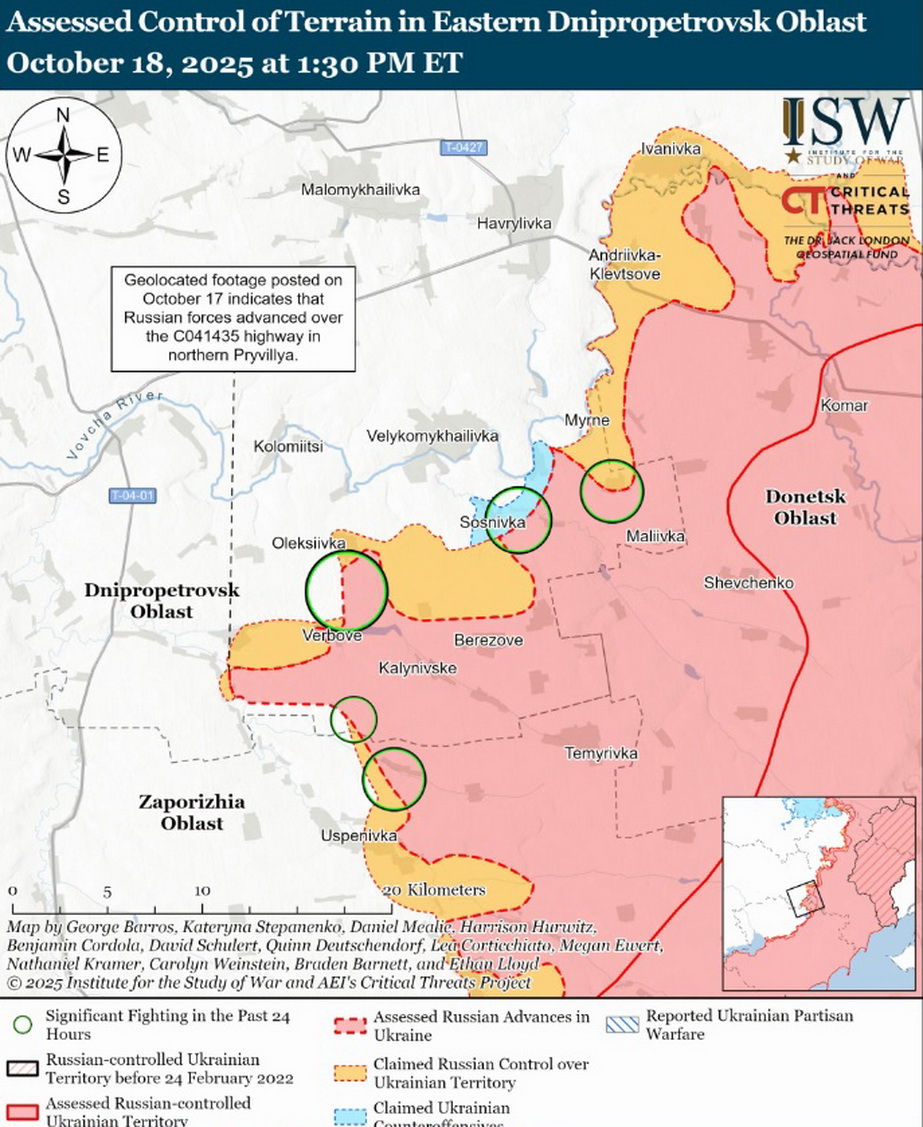 Аналітики посилаються на геолоковані відеозаписи, опубліковані 17 жовтня, де українські війська завдають ударів по російських у північному Привіллі (село у Синельниківському районі Дніпропетровської області).