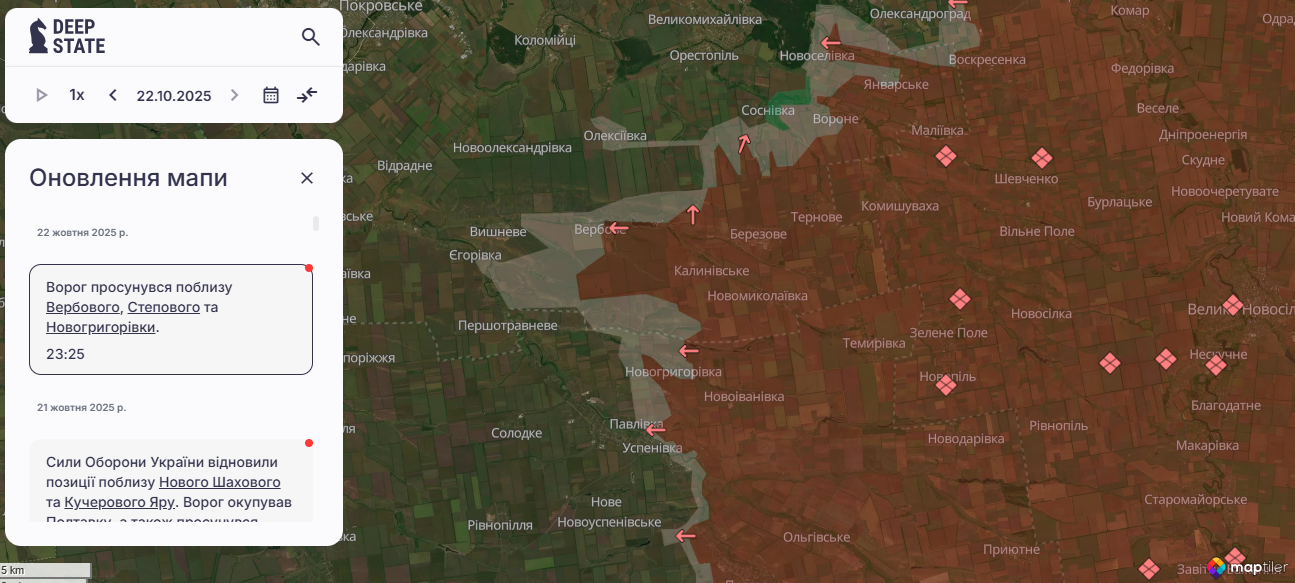 Ворог просунувся поблизу Новогригорівки у Запорізькій області. Зміни на мапі позначив аналітичний проєкт DeepState, передає "Справжнє".