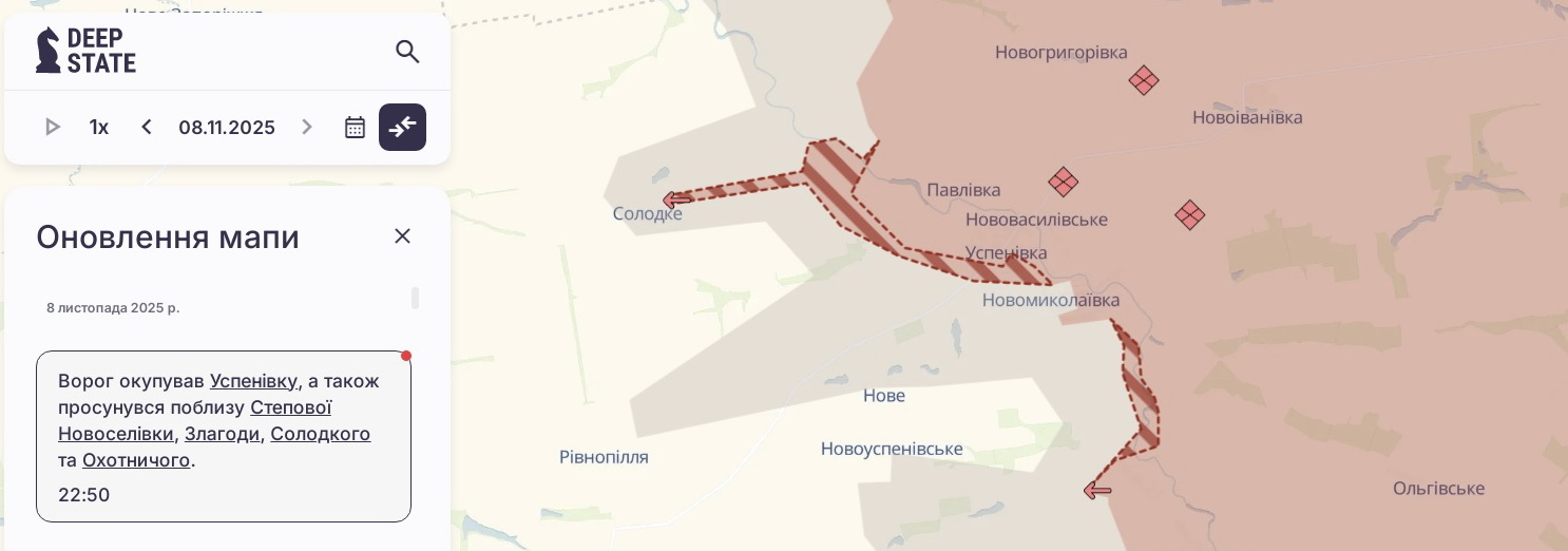 За даними аналітиків, ворог окупував Успенівку, а також просунувся поблизу Злагоди, Солодкого та Охотничого.