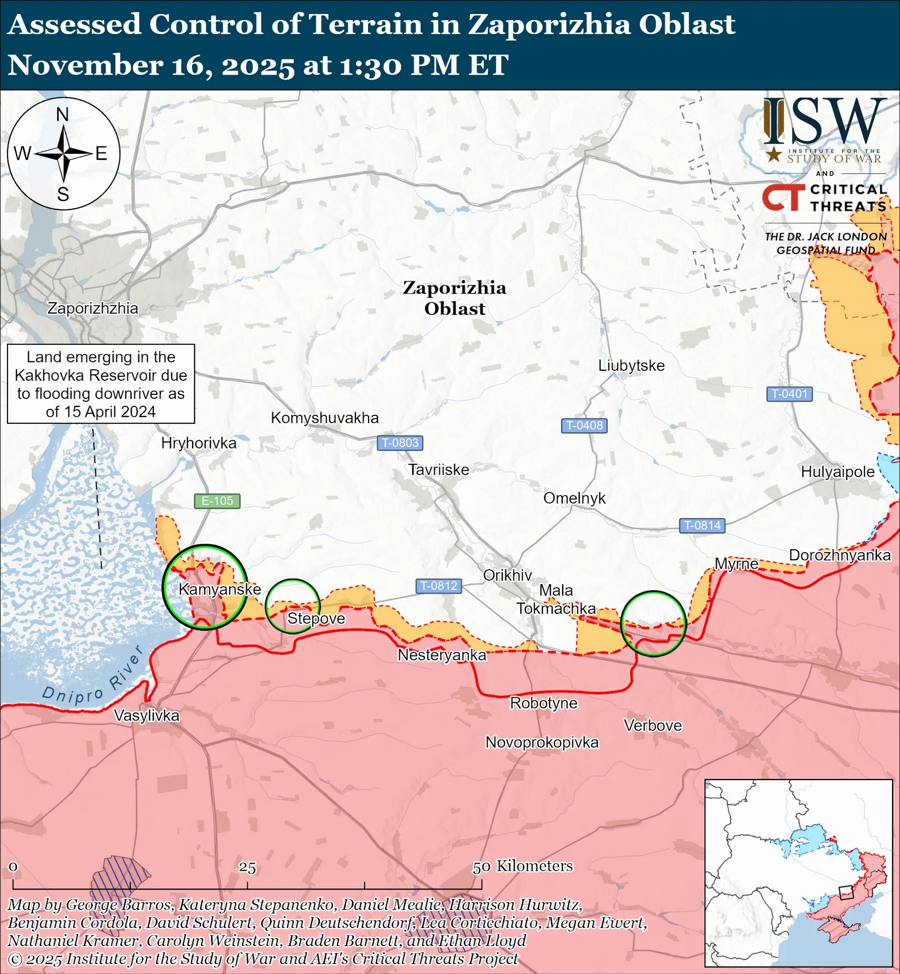 Також російські війська продовжили штурми на заході Запорізької області, але не досягли підтвердженого прогресу. За даними аналітиків, 15 і 16 листопада загарбники безуспішно наступали на Оріхівському напрямку поблизу Білогір’я, Степногірська, Плавнів, Приморського та Степового.
