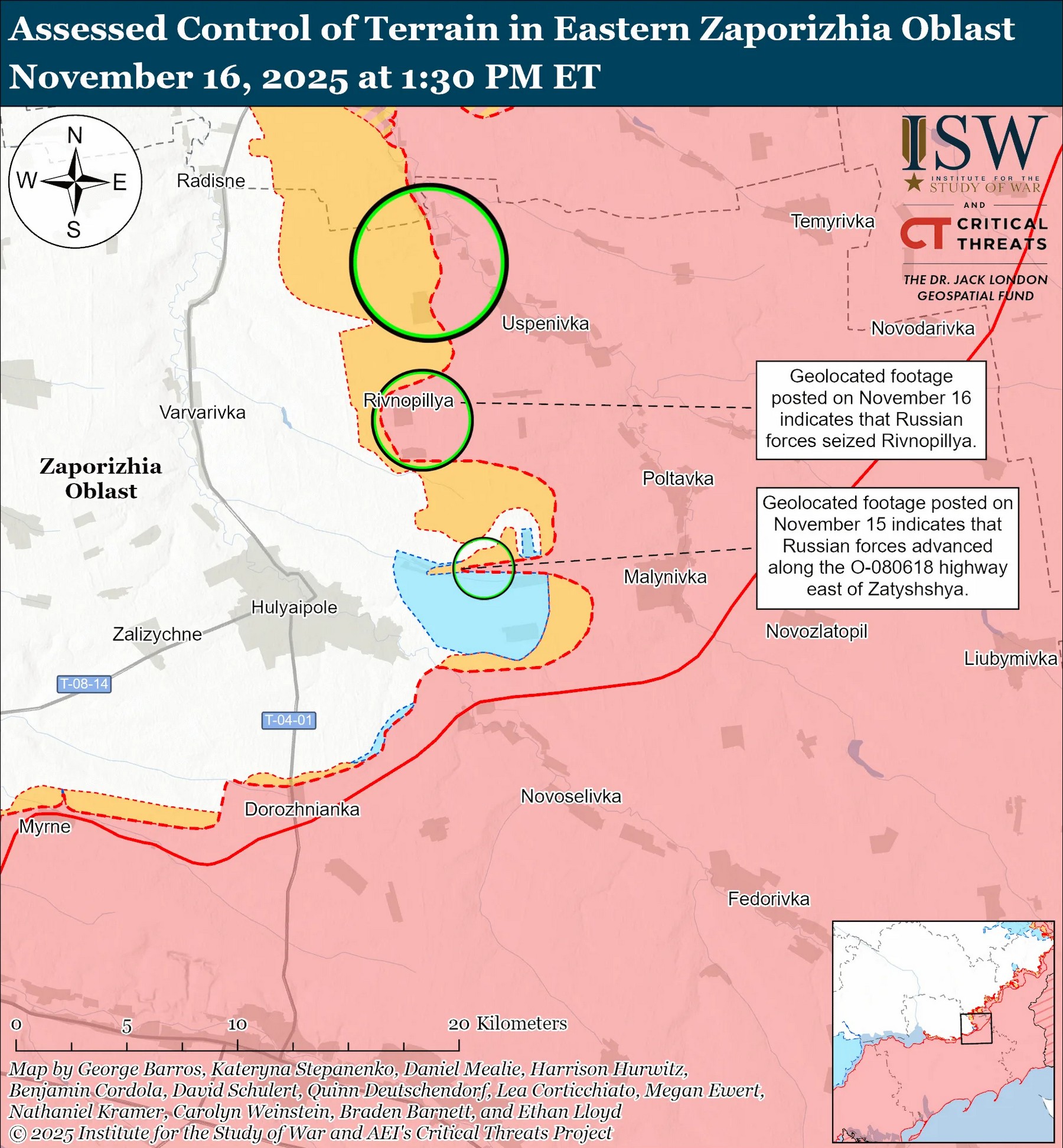 За оцінками західних аналітиків, геолокаційні відеозаписи, опубліковані 15 та 16 листопада, свідчать про те, що окупанти нещодавно захопили Рівнопілля та просунулися на схід від Затишшя, вздовж автомагістралі Гуляйполе-Малинівка.
