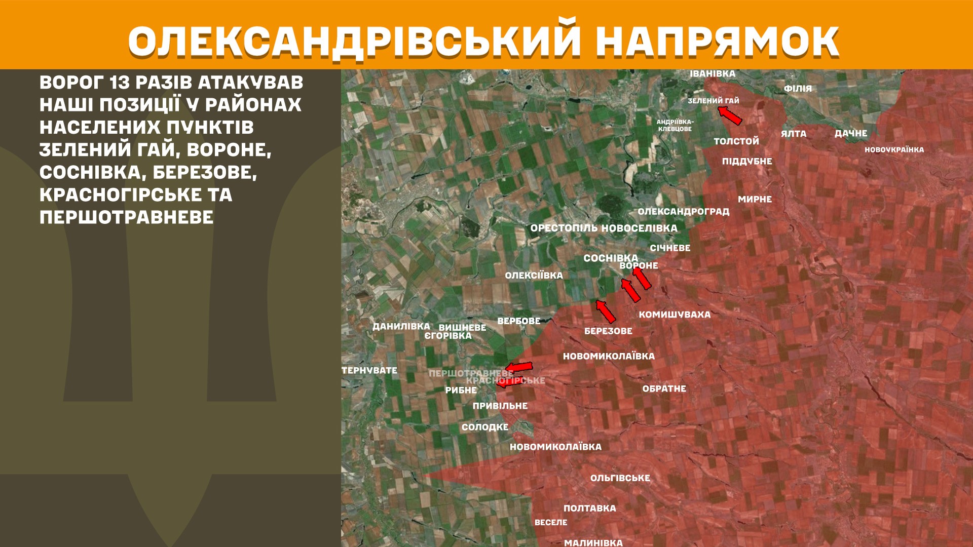 На Олександрівському напрямку ворог 13 разів атакував українські позиції, зокрема, біля запорізьких Красногірського та Першотравневого.