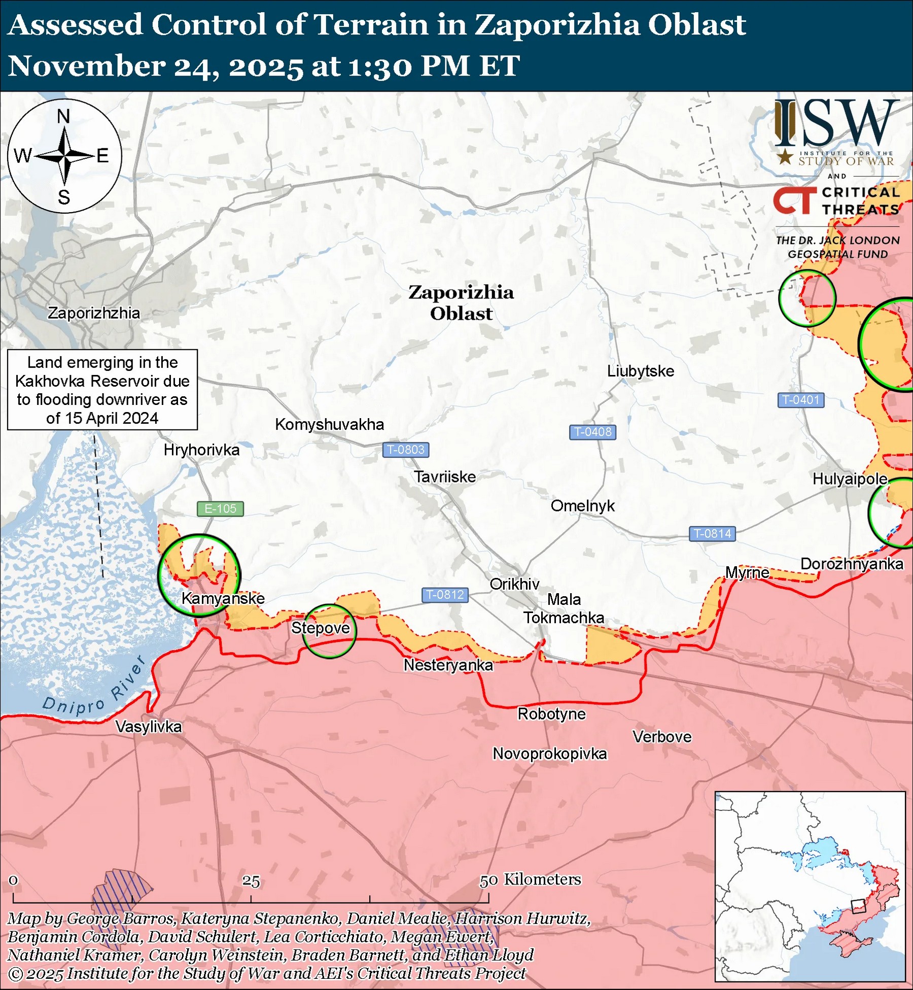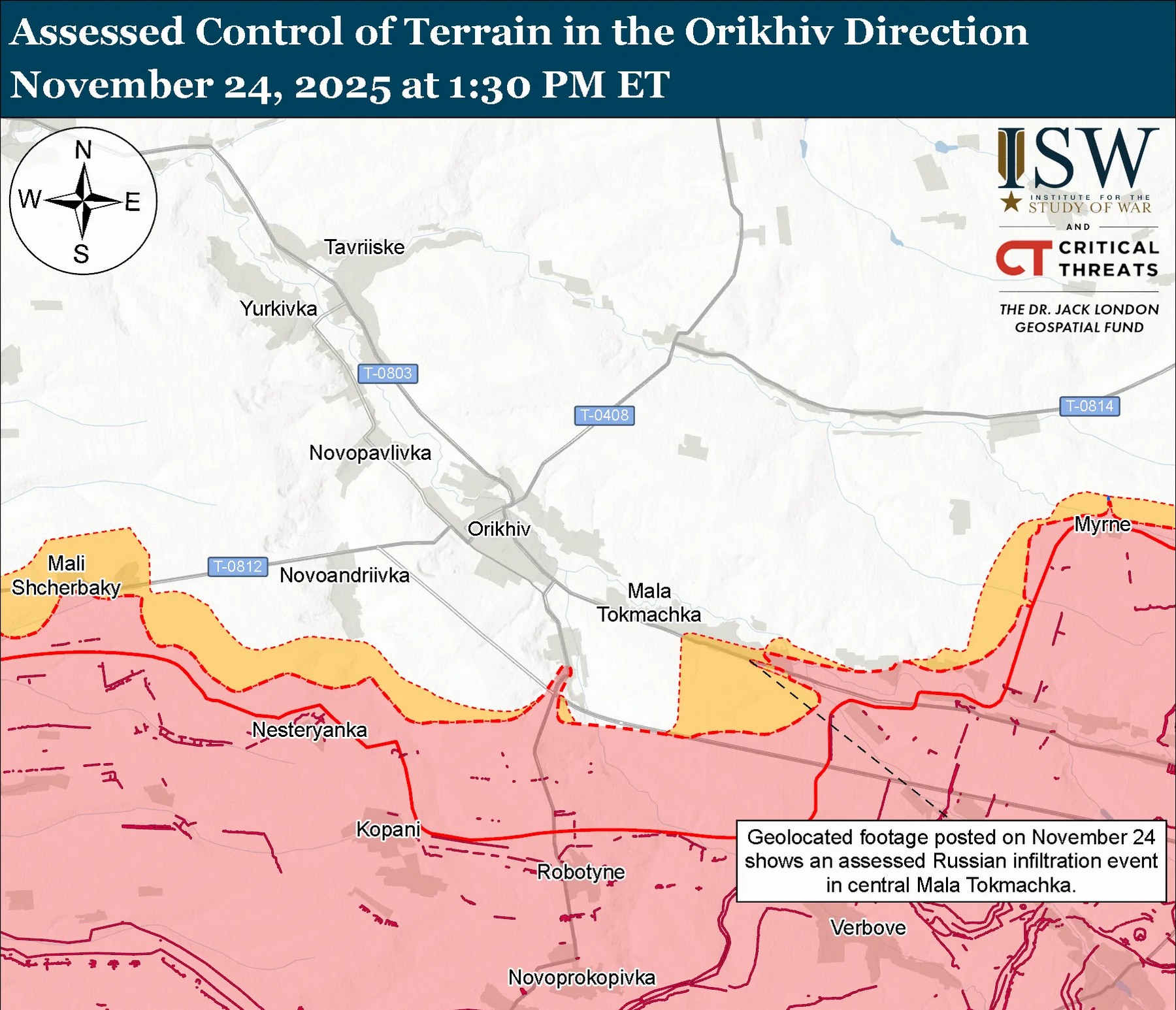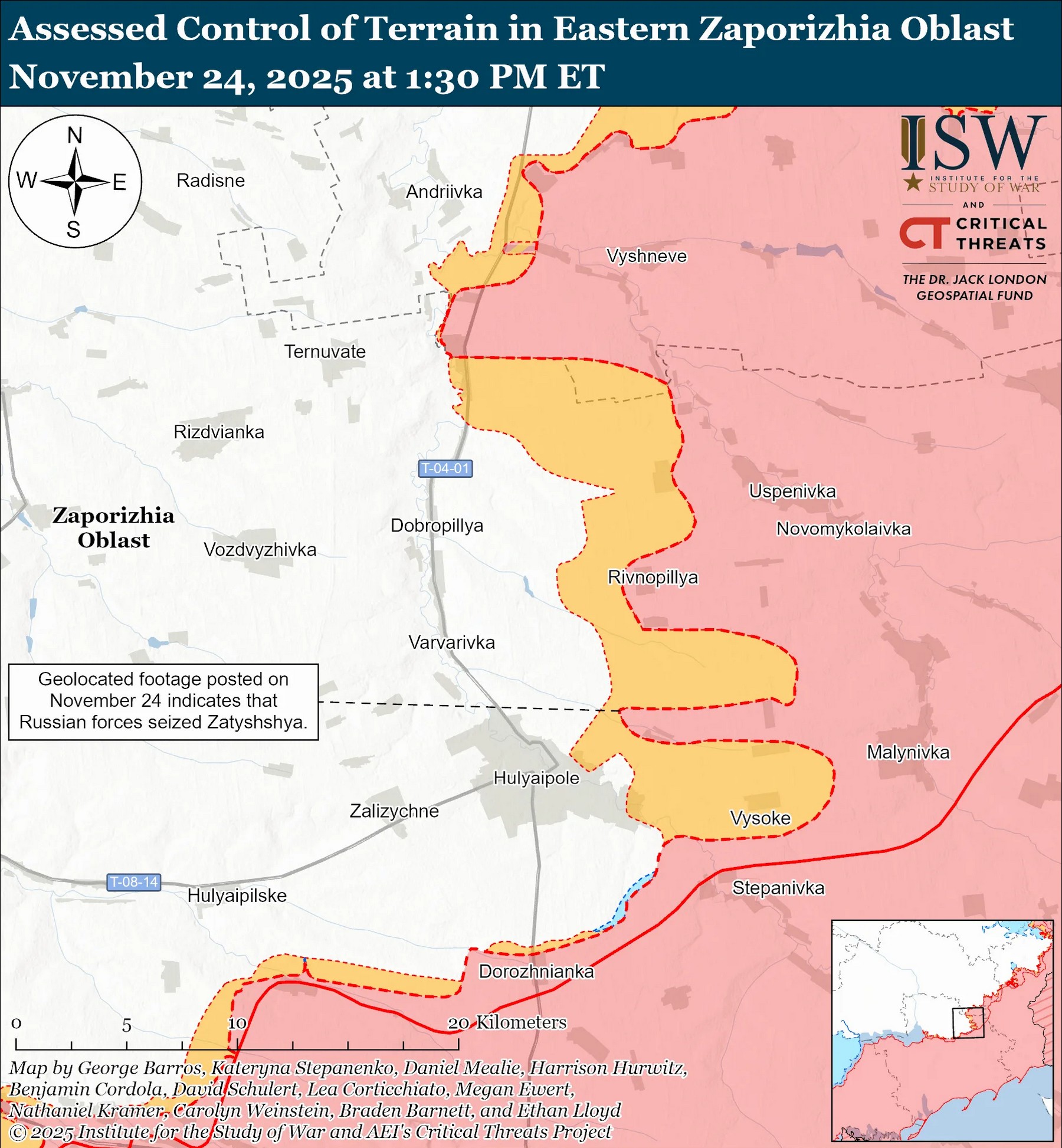 За словами західних аналітиків, геолокаційні відеозаписи, опубліковані 24 листопада, свідчать про те, що підрозділи РФ захопили Затишшя (приблизно за 2,6 кілометра на схід від Гуляйполя).
