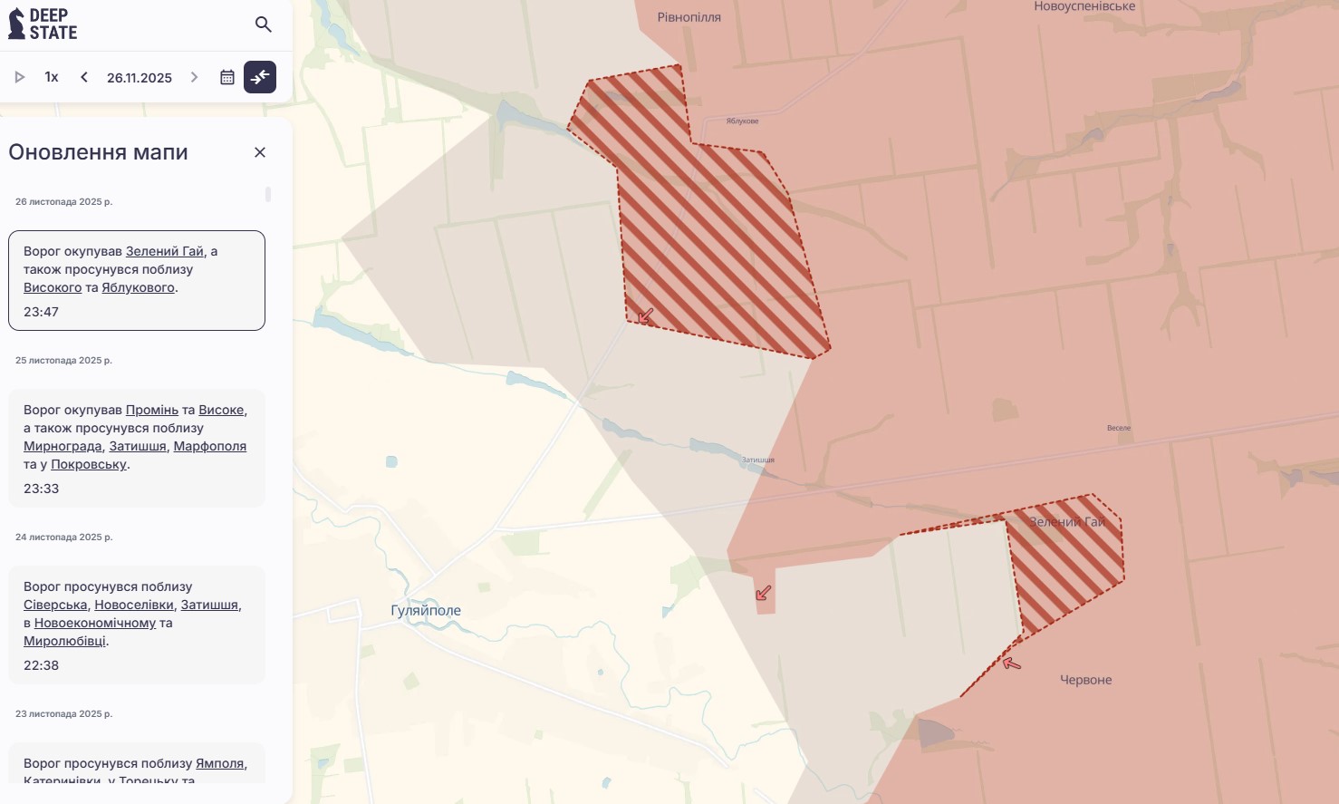 У четвер, 27 листопада, аналітичний проєкт DeepState повідомив, що російські війська захопили село Зелений Гай Пологівського району Запорізької області, передає "Справжнє".