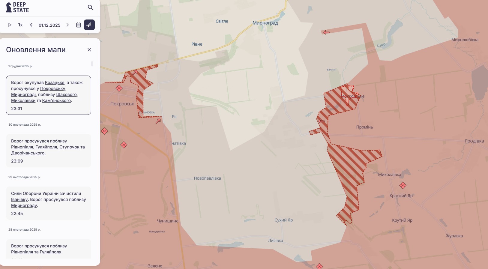 За інформацією українських аналітиків, на Донеччині російські війська захопили Козацьке (стара назва Московське), а також просунулися в Покровську, Мирнограді, поблизу Шахового та Миколаївки.